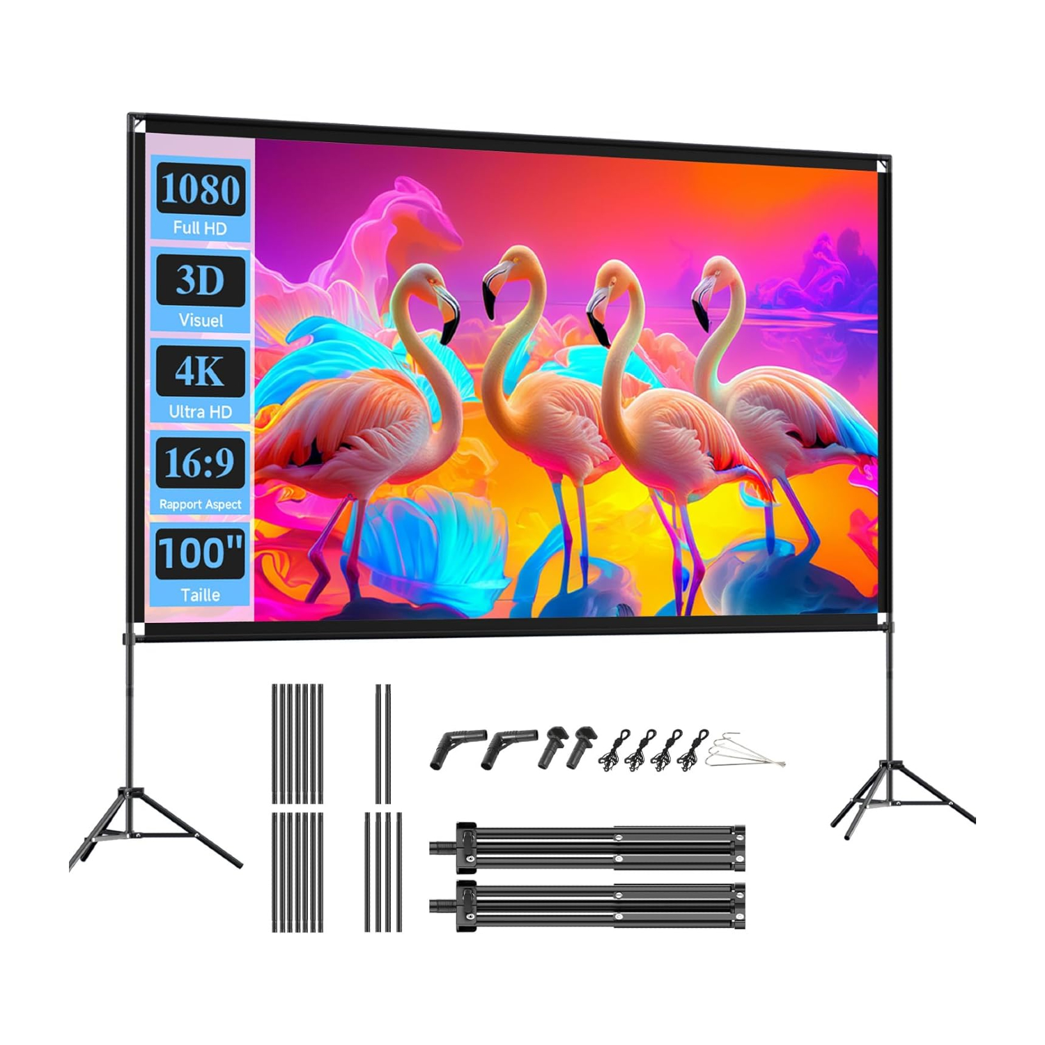 Écran vidéo Projecteur pour l’Extérieur 100 Pouces Sur pied, Format 16:9, Montage Trépied et Ancrage Sol