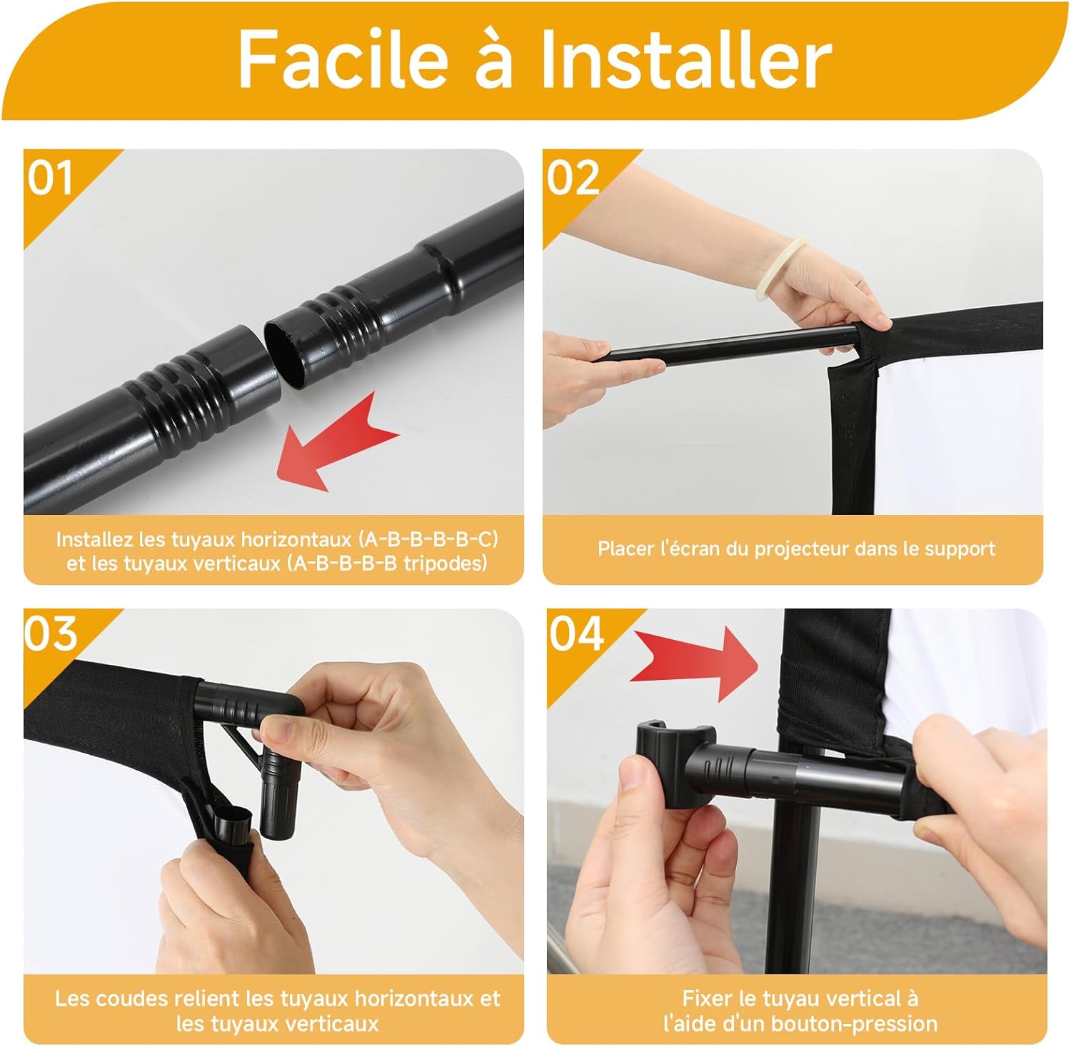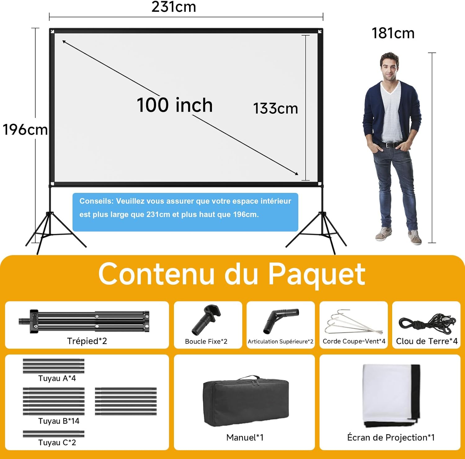 Notre toile de projection grand format s’appuie sur une armature en fer tubulaire associée à un trépied conçu pour absorber les contraintes mécaniques liées à une utilisation en conditions extérieures. Quatre cordes de tension et quatre pointes d’ancrage au sol sont incluses afin de sécuriser l’ensemble face aux aléas climatiques courants. L’assemblage ne requiert aucun outil spécifique : les vingt tubes métalliques s’emboîtent selon une logique intuitive détaillée dans le manuel fourni. Le démontage est tout aussi rapide, ce qui permet de plier et ranger l’ensemble en quelques minutes seulement. Cette facilité d’installation fait de notre dispositif un équipement événementiel particulièrement adapté aux configurations temporaires.