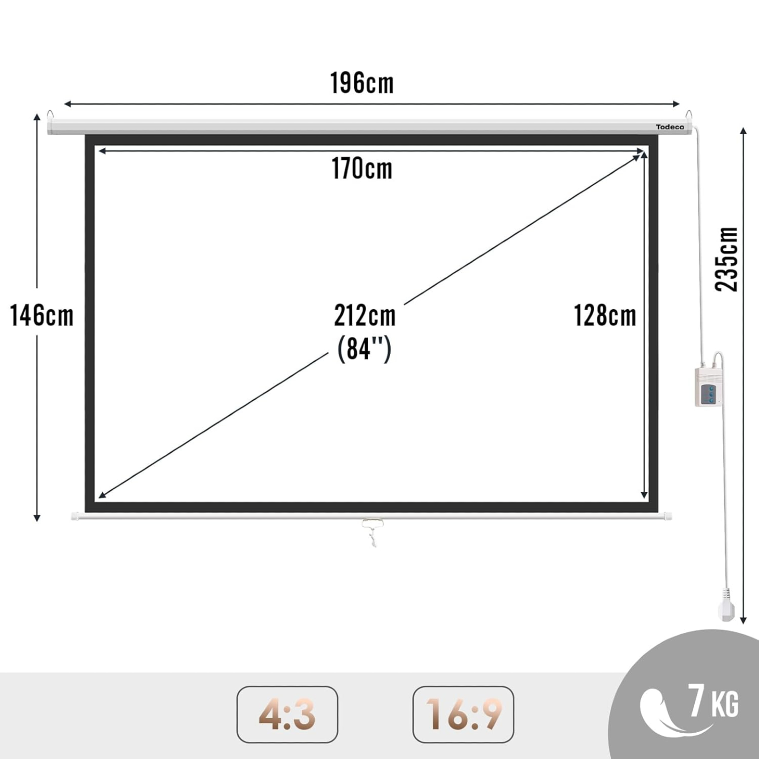 Le système de fixation permet une installation murale ou plafond avec une intégration adaptée aux espaces résidentiels et professionnels. Les dimensions de 196 x 146 cm et le poids d’environ 7 kg facilitent la mise en place dans différents environnements. La longueur de câble de 2,35 m permet une connexion pratique au système de commande. L’ensemble est compatible avec des usages variés tels que home cinéma, salles de réunion, écoles et événements.