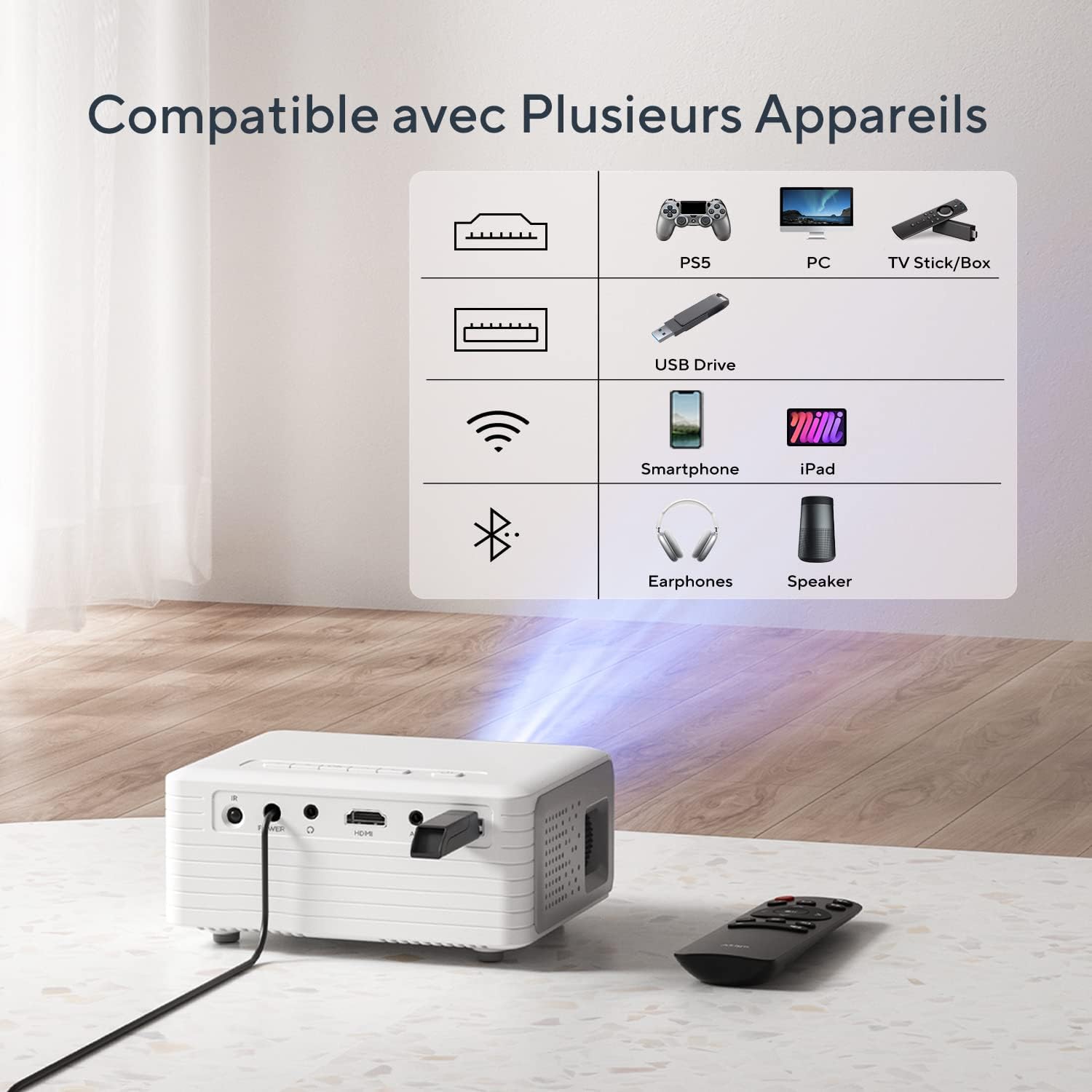 Notre équipement de projection compact intègre une source lumineuse LED délivrant un flux de 1500 lumens, garantissant une clarté optimale pour vos sessions de cinéma à domicile. Ce Mini Projecteur 1500 Lumens dispose d’une connectivité sans fil WiFi et Bluetooth pour faciliter la diffusion de contenus depuis divers appareils mobiles. Sa conception portable s’accompagne d’un trépied ajustable, permettant une installation stable et précise sur n’importe quelle surface plane.