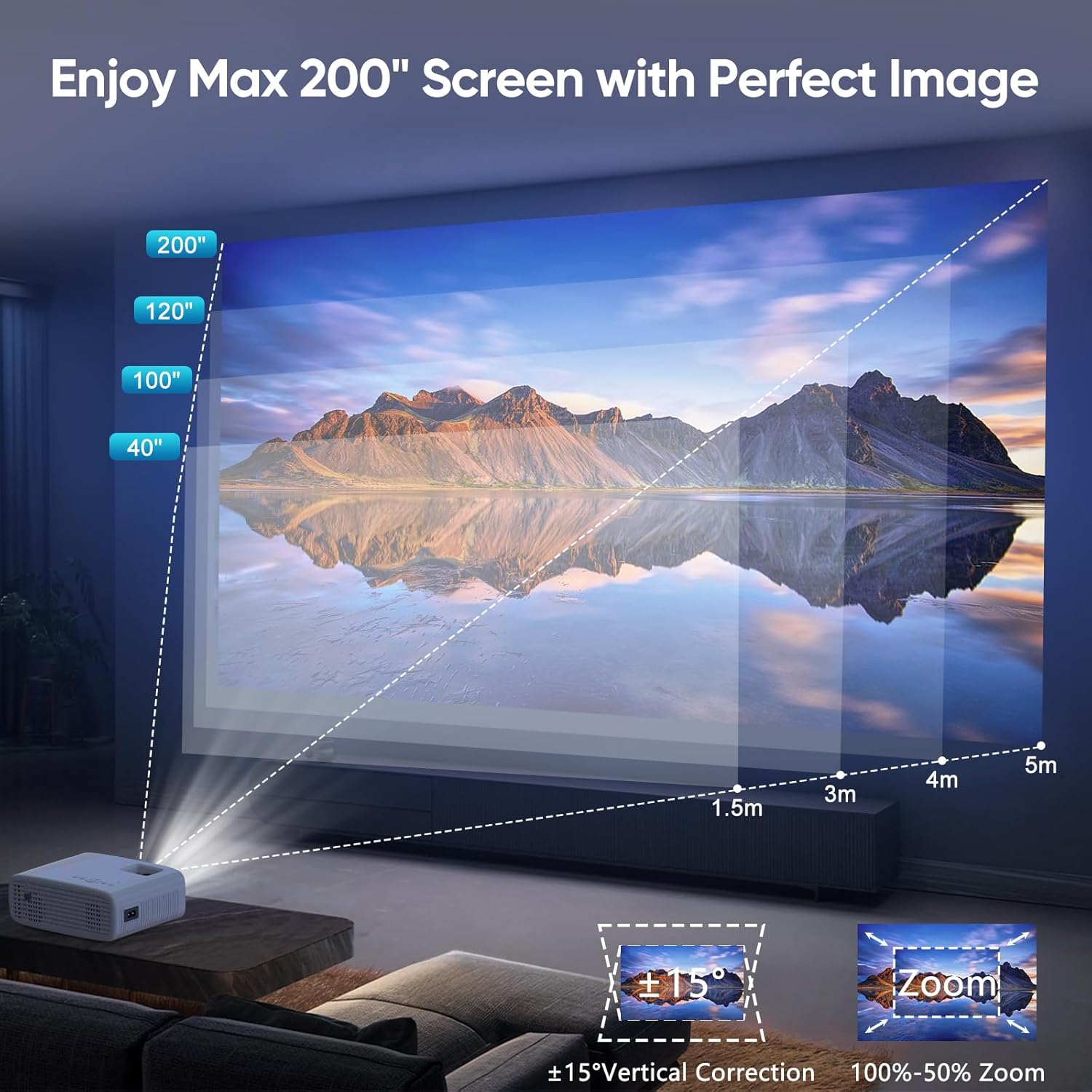 L’installation repose sur une correction trapézoïdale verticale de ±15° et une molette de mise au point manuelle. Notre fonction Zoom numérique de 50% à 100% autorise l’ajustement de la taille de l’image sans déplacer l’appareil. La distance de projection varie entre 1,5 et 5 mètres pour s’adapter à votre espace. Le système de refroidissement intégré maintient une température stable durant les sessions prolongées.