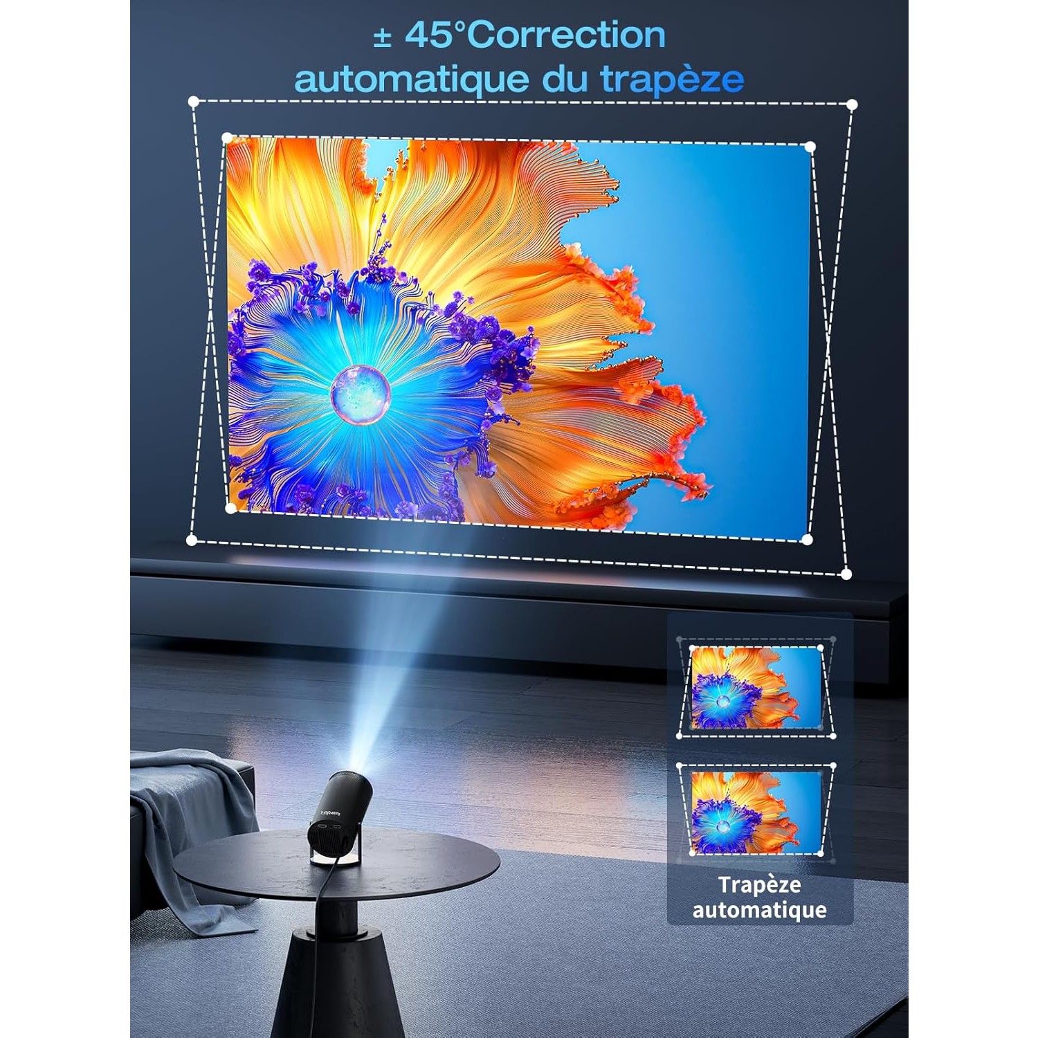 Le châssis est conçu pour une rotation à 180°, autorisant une diffusion sur les murs, le sol ou le plafond de votre pièce. Nous intégrons une correction trapézoïdale automatique de ±45° qui rectifie instantanément la géométrie de l’image sans intervention manuelle. Vous pouvez ainsi obtenir un rectangle parfait même si l’appareil est positionné de manière décentrée.