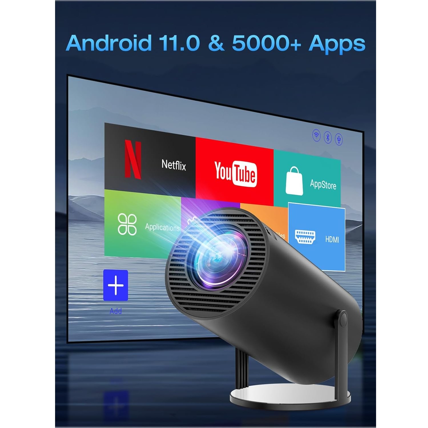 La puce WiFi 6 double bande (2.4G et 5G) assure une transmission de données stable et rapide pour le streaming ou le mirroring. Le module Bluetooth 5.2 permet de jumeler des enceintes externes ou des casques sans fil avec une latence minimale. Ces technologies garantissent une synchronisation parfaite entre l’image projetée et votre système audio personnel.