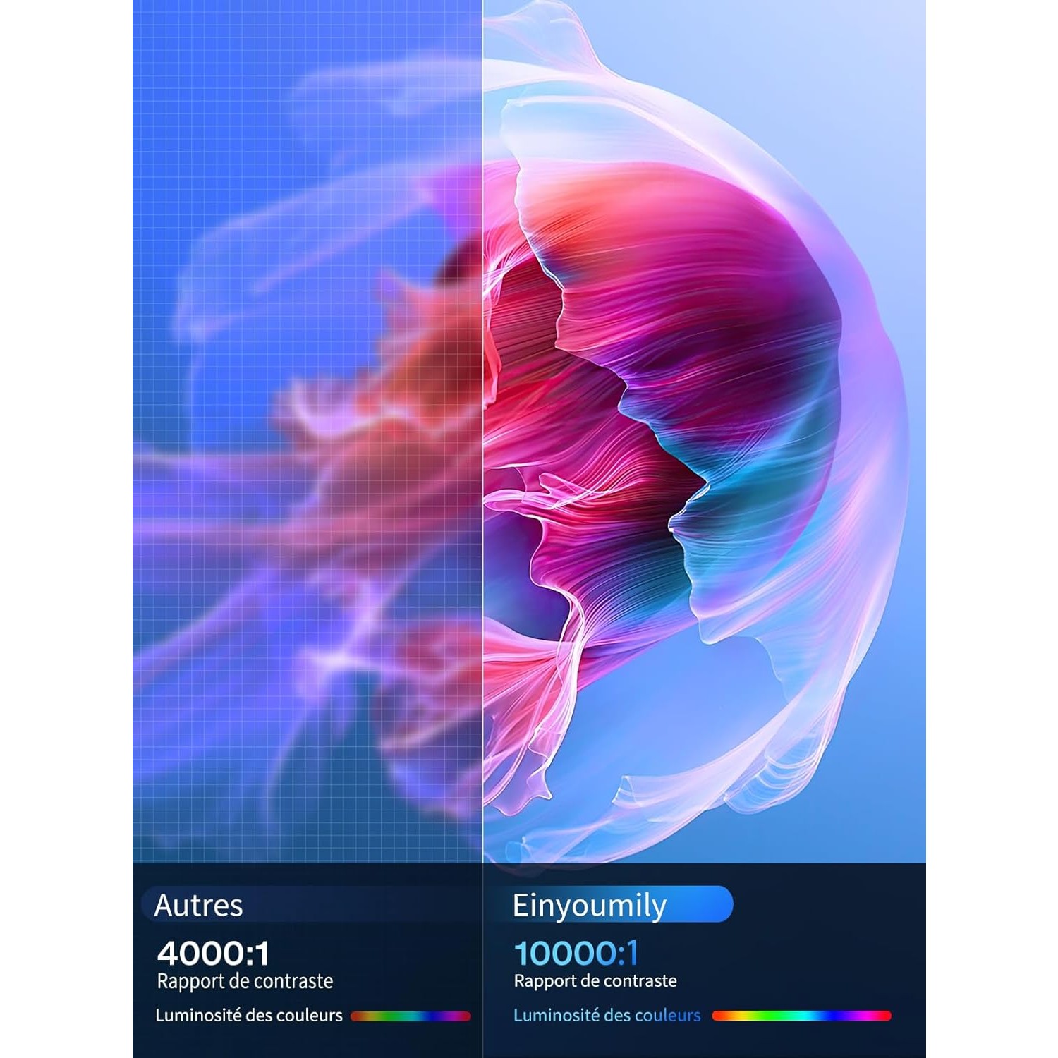 Notre projecteur utilise une source lumineuse LED de 15 000 Lux couplée à une matrice LCD pour produire des couleurs riches. Cette puissance lumineuse permet une utilisation confortable dans des environnements contrôlés, tout en assurant une longévité importante de la lampe. Le contraste est optimisé pour maintenir la lisibilité des détails dans les zones sombres de l’image.