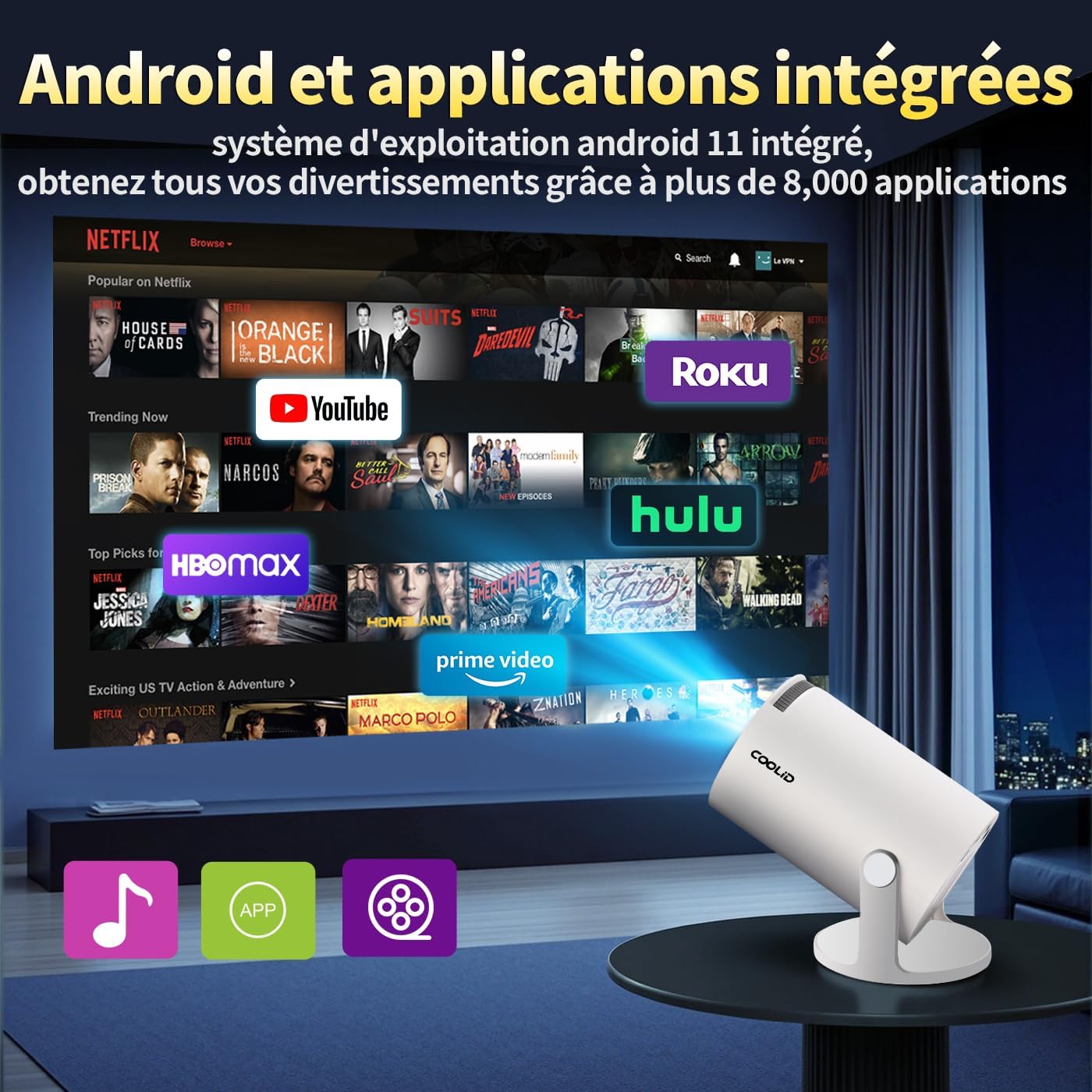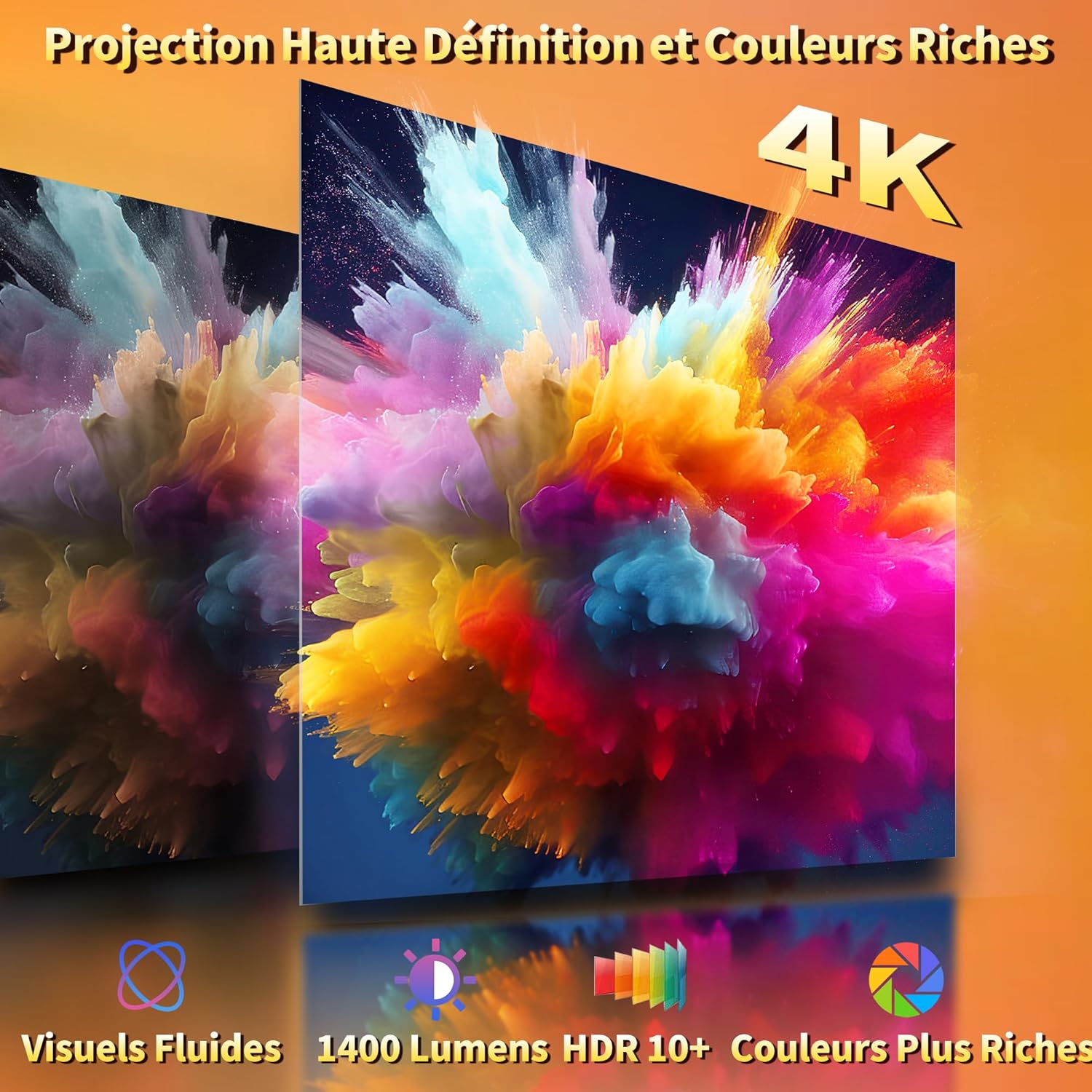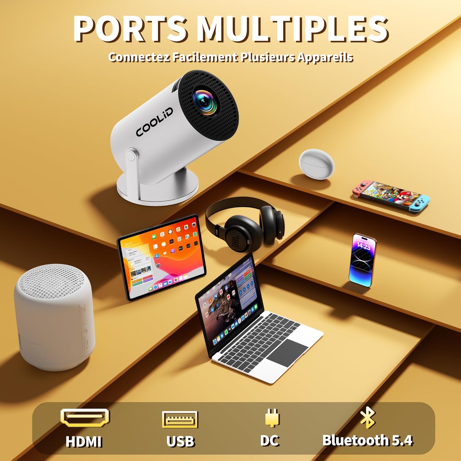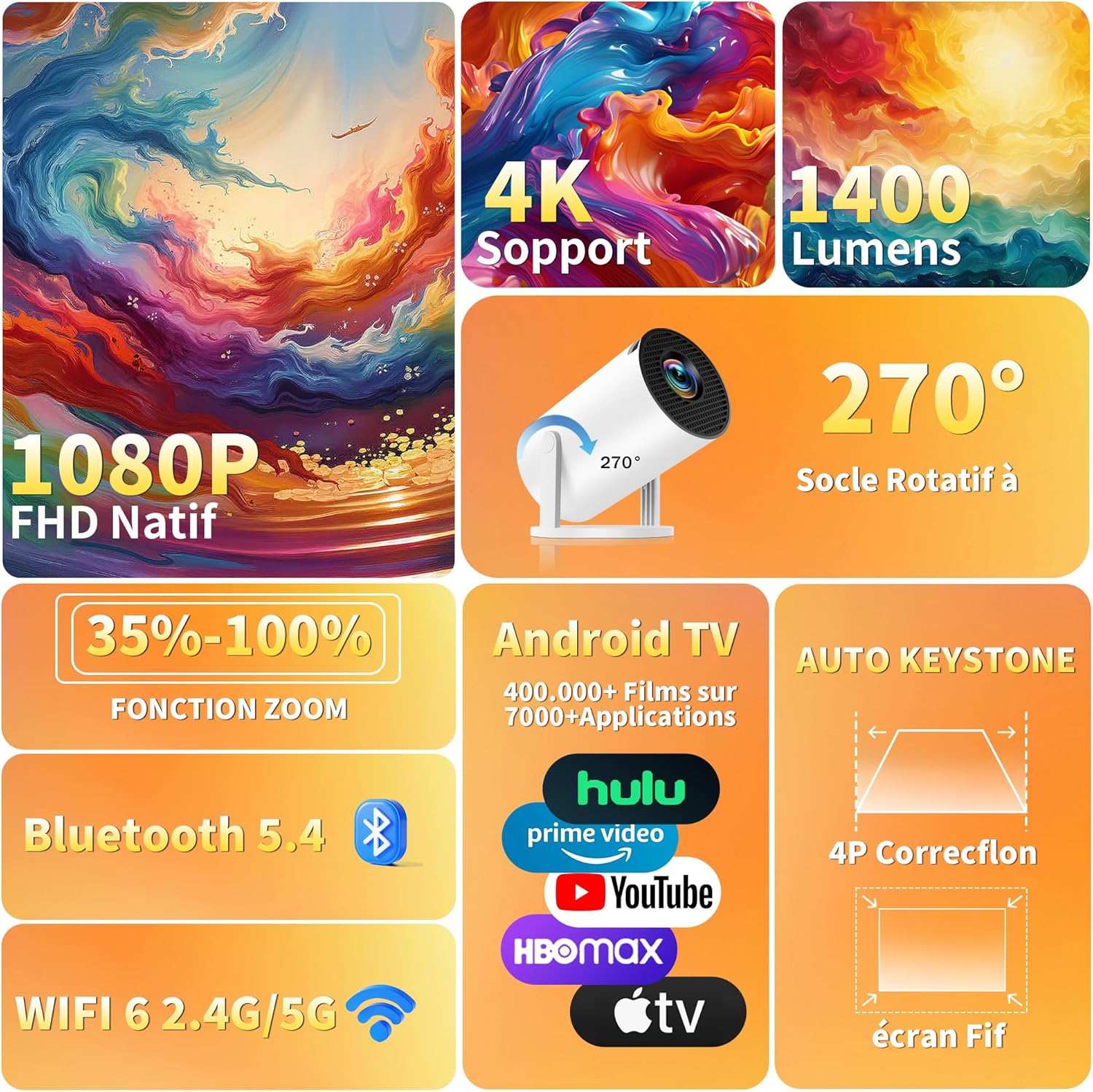 Notre solution de projection combine une résolution Full HD native de 1920 x 1080 pixels avec une compatibilité de décodage 4K Ultra HD. Ce Mini Projecteur Compact intègre un système d’exploitation Android avec 1 Go de RAM et 8 Go de stockage pour une navigation fluide. L’appareil délivre une luminosité de 1400 lumens et un contraste de 2000:1 pour un usage en home cinéma.