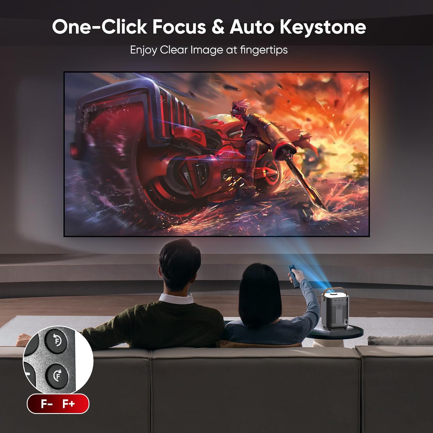 Notre Mini Projecteur Portable Auto Keystone dispose d’un système de correction trapézoïdale automatique pour garantir une image rectangulaire instantanée. La mise au point électrique se pilote directement via la télécommande avec les touches F+/F-, éliminant tout réglage manuel fastidieux. La fonction zoom électrique permet de réduire la taille de l’image de 100% à 50% sans déplacer l’appareil.