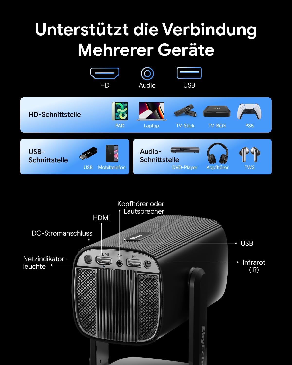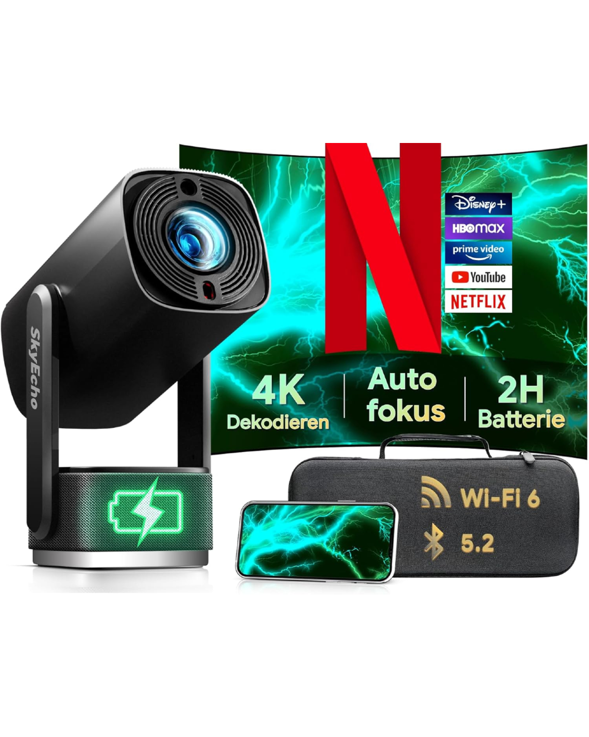 Notre système de projection mobile repose sur une architecture connectée optimisée pour les usages modernes. L’intégration d’Android permet un accès direct aux applications multimédias et contenus en streaming. La connectivité Wi-Fi 6 et Bluetooth 5.2 assure une transmission rapide et stable des données. Le dispositif prend en charge différents formats de lecture pour une compatibilité étendue avec les contenus numériques. L’ensemble garantit une expérience fluide sur écran large dans divers environnements.