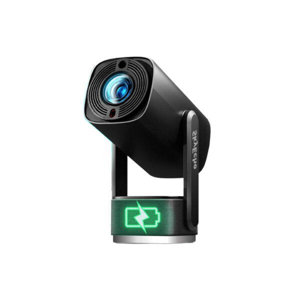 La batterie intégrée de 5200 mAh permet jusqu’à 2 heures de lecture vidéo sur une charge complète. Le format compact et le poids de 0,8 kg facilitent le transport et l’installation. La monture à cardan 270° offre une grande liberté d’orientation de projection, y compris au plafond. Les dimensions de 14 x 33 x 33 cm optimisent l’intégration dans différents espaces. L’ensemble assure une utilisation mobile adaptée aux déplacements.
