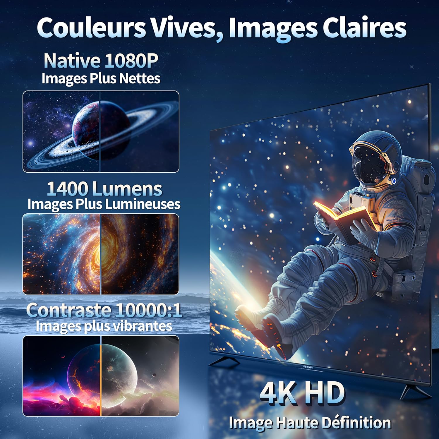 Notre Mini Vidéoprojecteur Wi-Fi combine une résolution native 1920 × 1280 avec un décodage 4K Ultra HD pour offrir une image détaillée et fluide en usage domestique ou nomade. La technologie LED avancée assure une projection homogène avec un contraste de 10000:1, adapté aux films, séries et jeux vidéo. La luminosité annoncée jusqu’à 8000 lumens permet une visibilité renforcée dans différents environnements. L’ensemble garantit une expérience visuelle immersive sur grand écran jusqu’à 240 pouces.