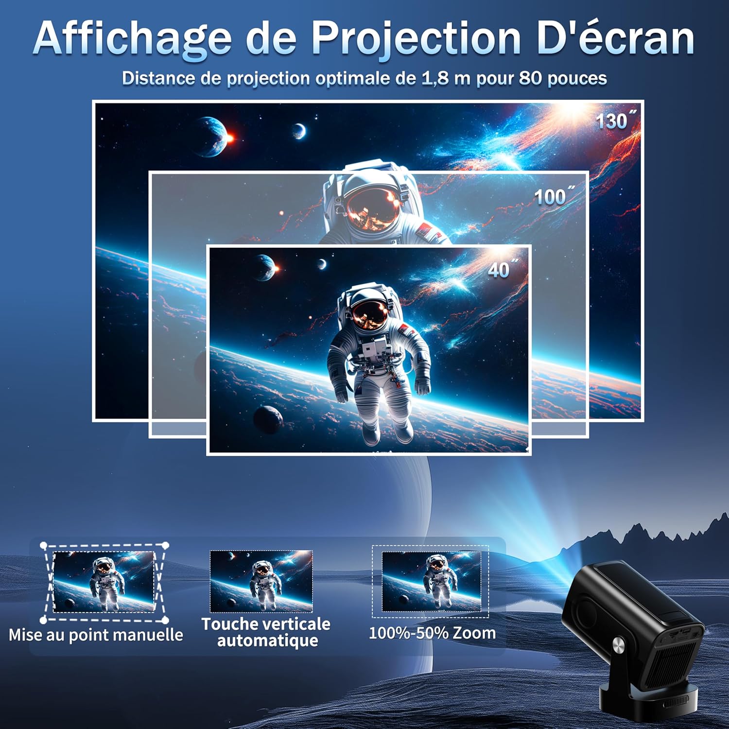 Projection flexible 270°, distance ajustable et format portable