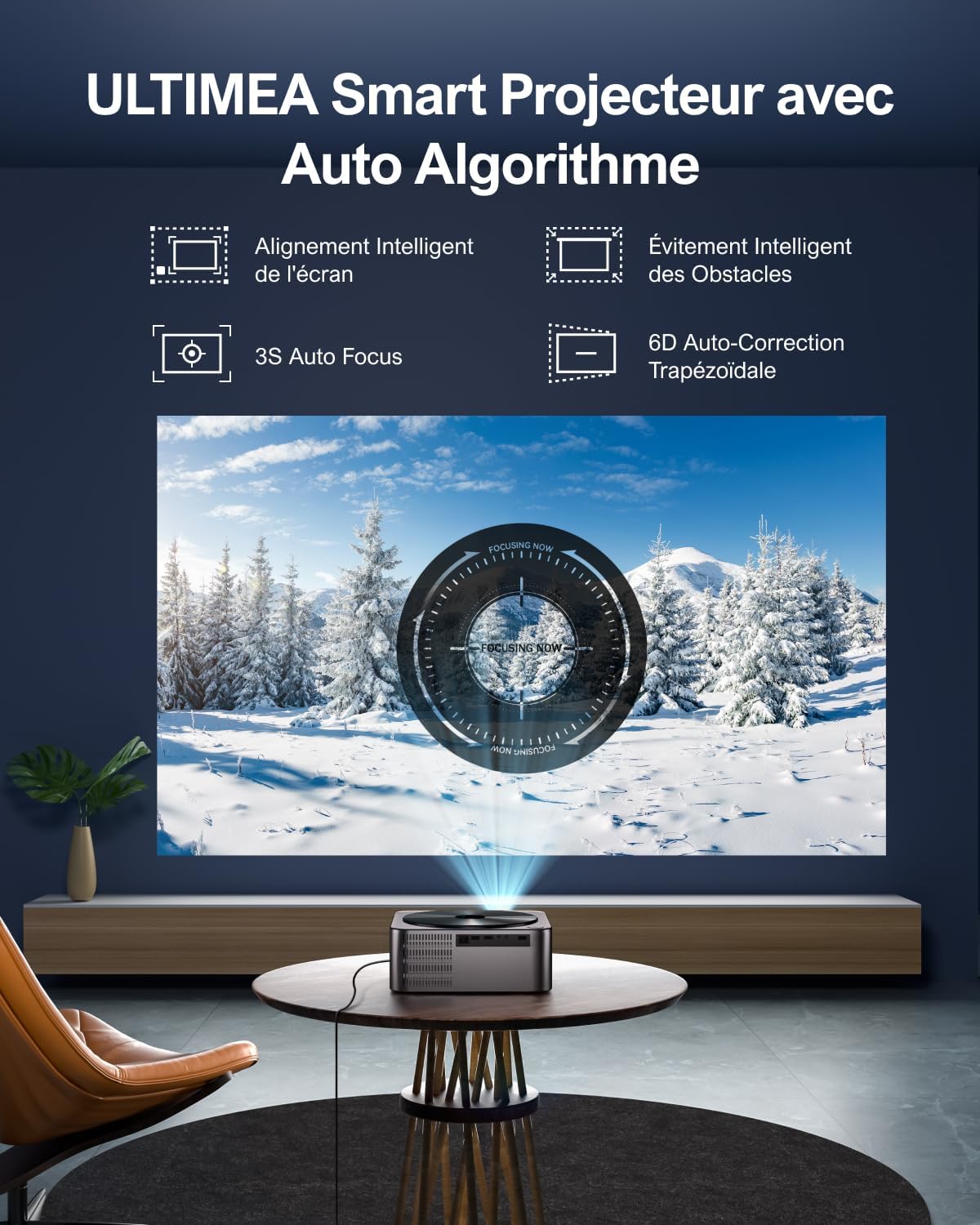 La caméra IA intégrée pilote un système d’autofocus instantané pour garantir la netteté de l’image en trois secondes. Notre technologie de correction automatique du trapèze 6D ajuste l’alignement sur un angle de ±50° sans intervention manuelle. La fonction zoom numérique autorise une réduction de la taille de l’affichage de 100% à 50% pour adapter l’image à la surface de projection.