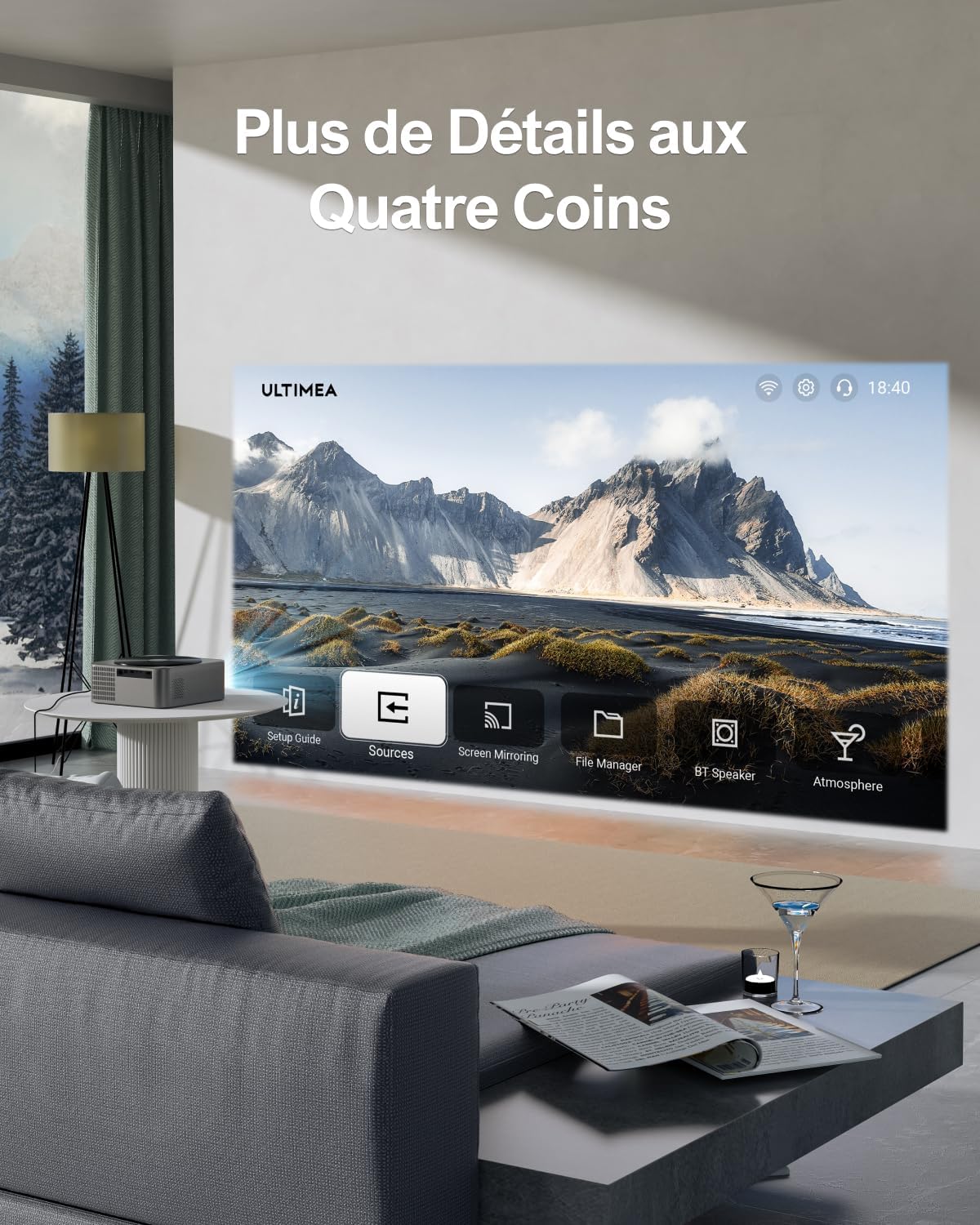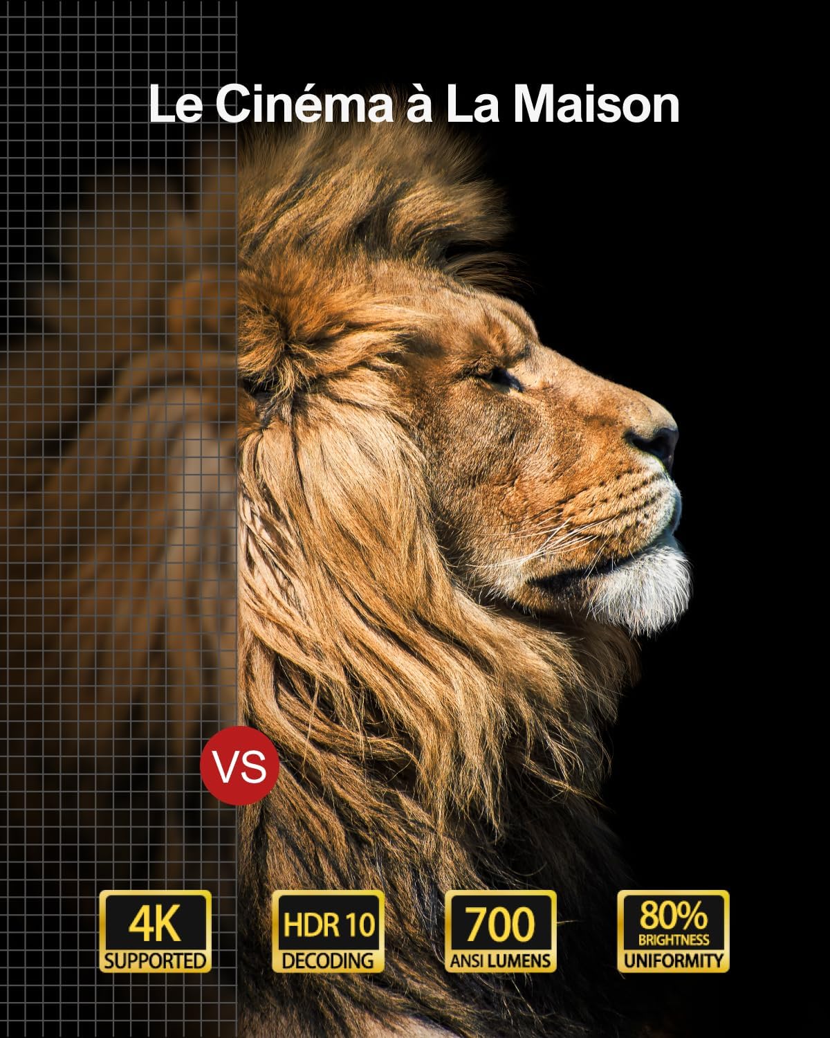 Le panneau LCD haut de gamme associé à une technologie de cône lumineux optimisée produit une luminosité de 700 ANSI Lumens. Notre système affiche une uniformité de luminosité de 80%, ce qui maintient une visibilité claire sous un éclairage ambiant modéré. Le contraste est renforcé par la gestion du HDR10, révélant des détails précis dans les zones sombres de l’image.