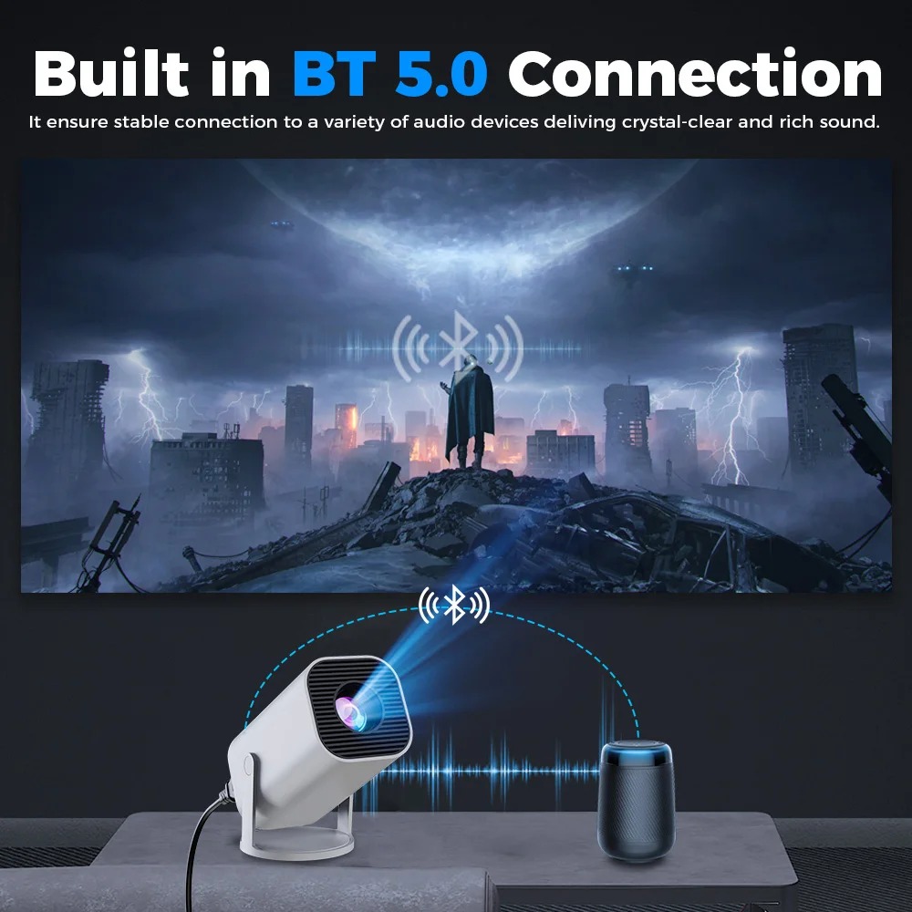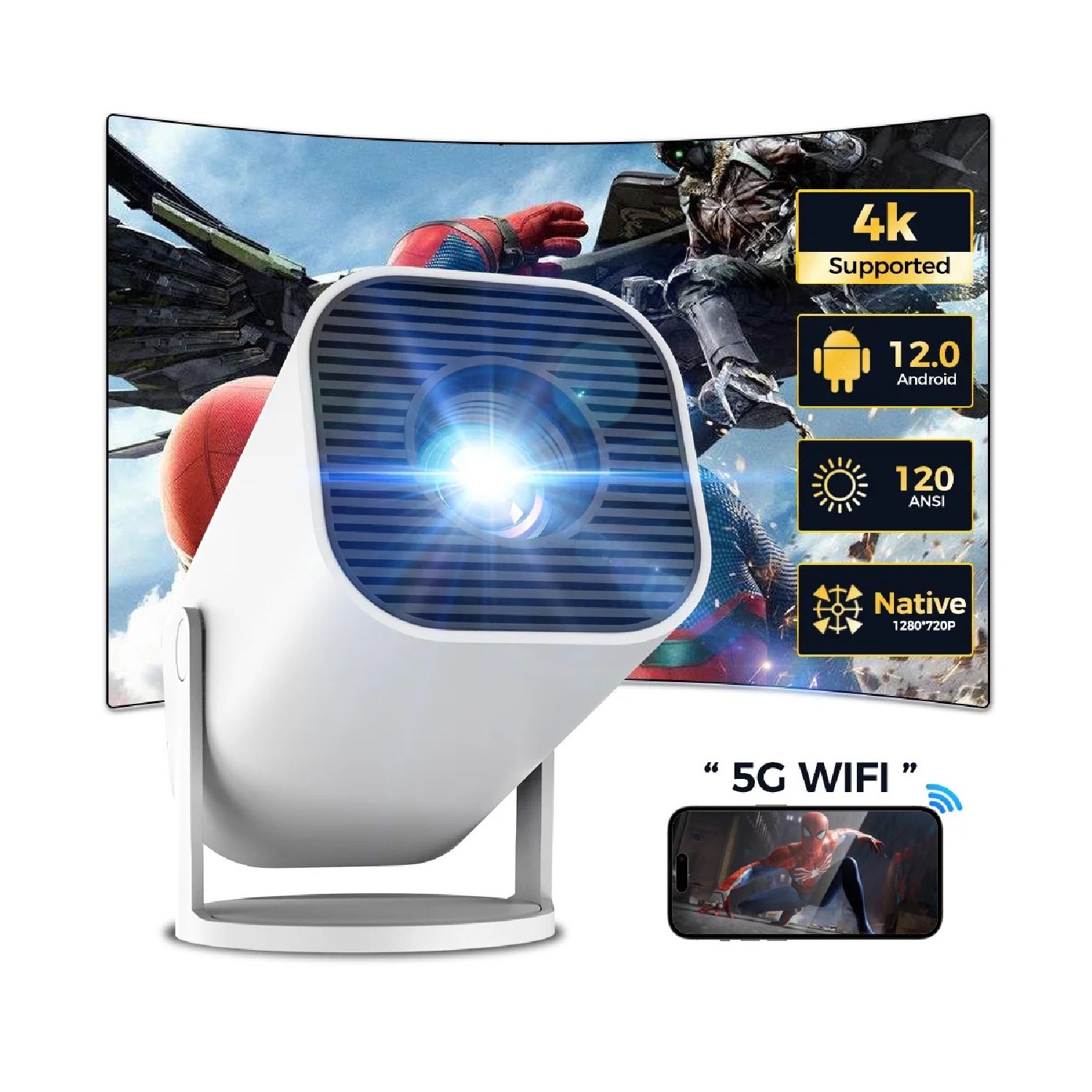 Vidéoprojecteur LED 720P Natif Android 12.0 avec WiFi6 et Support 4K pour Home Cinéma