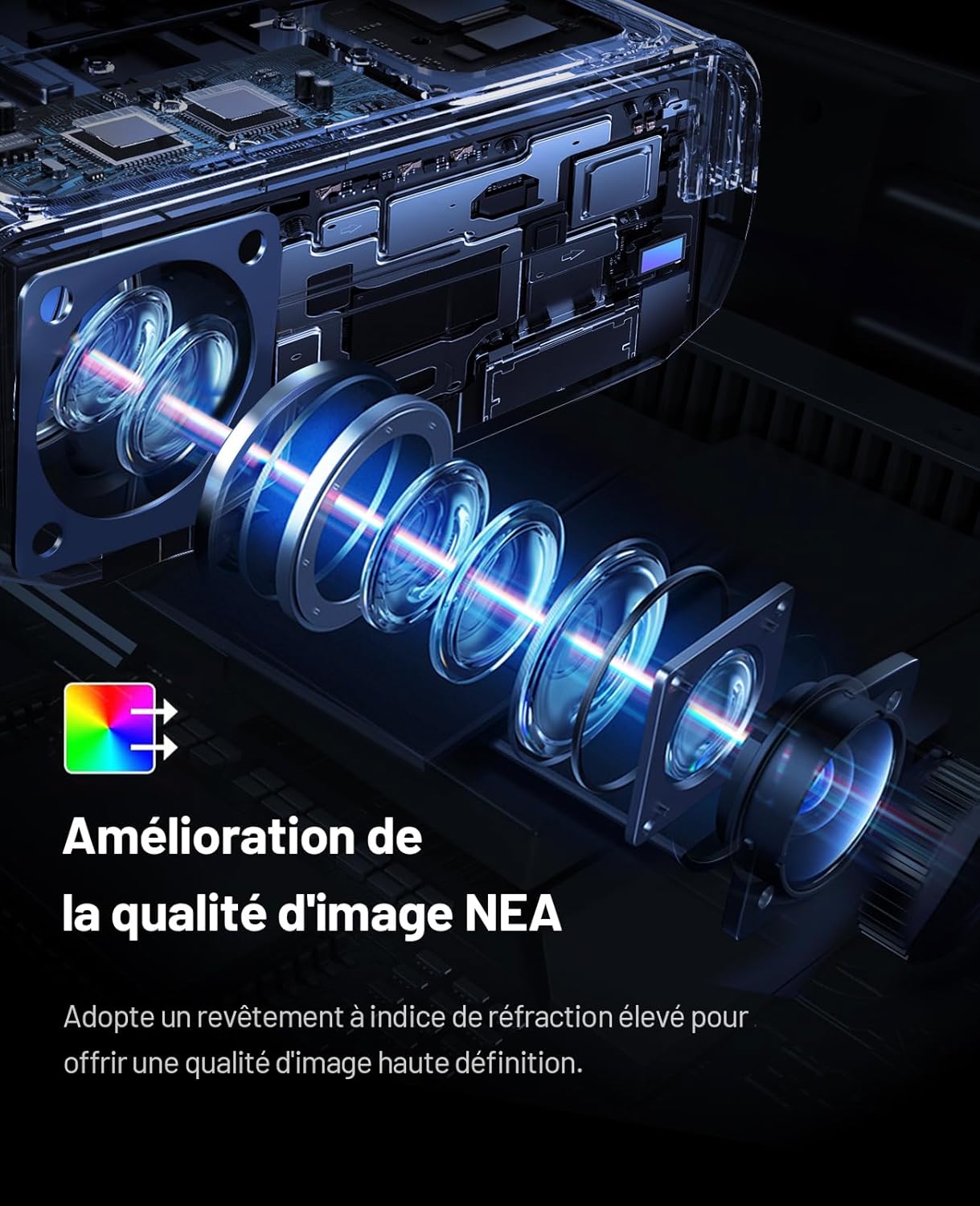 L’optique permet de projeter une image comprise entre 45 pouces et 200 pouces de diagonale selon le recul choisi. La distance de projection minimale est fixée à 2,8 pieds, ce qui autorise une utilisation dans des espaces restreints. Notre bloc optique est conçu pour maintenir une mise au point uniforme sur toute la surface de l’écran. La source lumineuse de 3 Watts offre une efficacité énergétique constante pour les projections de longue durée.