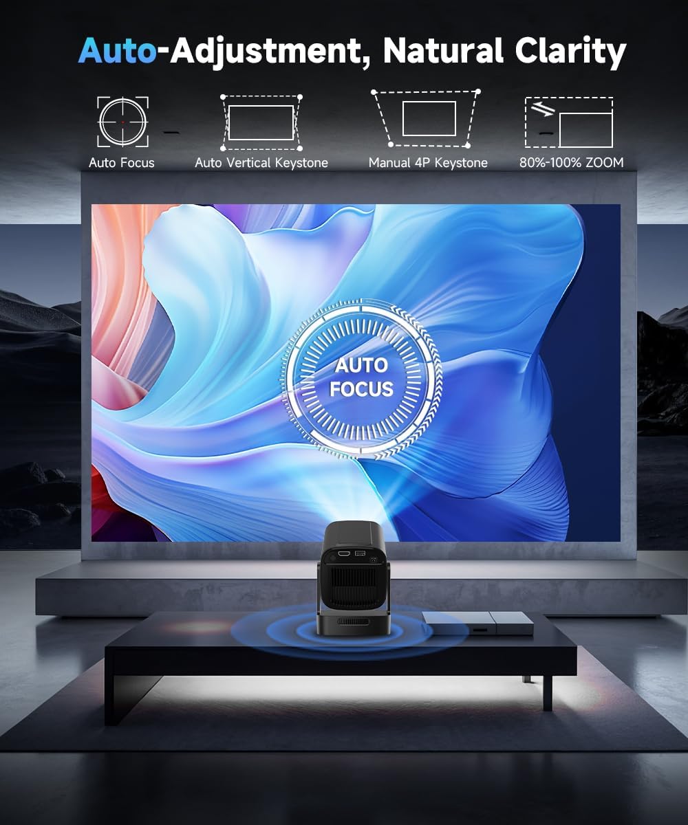 Le châssis dispose d’un mécanisme de rotation à 180° permettant de projeter vers les murs ou le plafond sans accessoires supplémentaires. Notre système intègre une mise au point automatique ainsi qu’une correction trapézoïdale verticale automatique pour un alignement immédiat. Ces capteurs garantissent une géométrie d’image rectangulaire dès l’allumage de l’appareil.