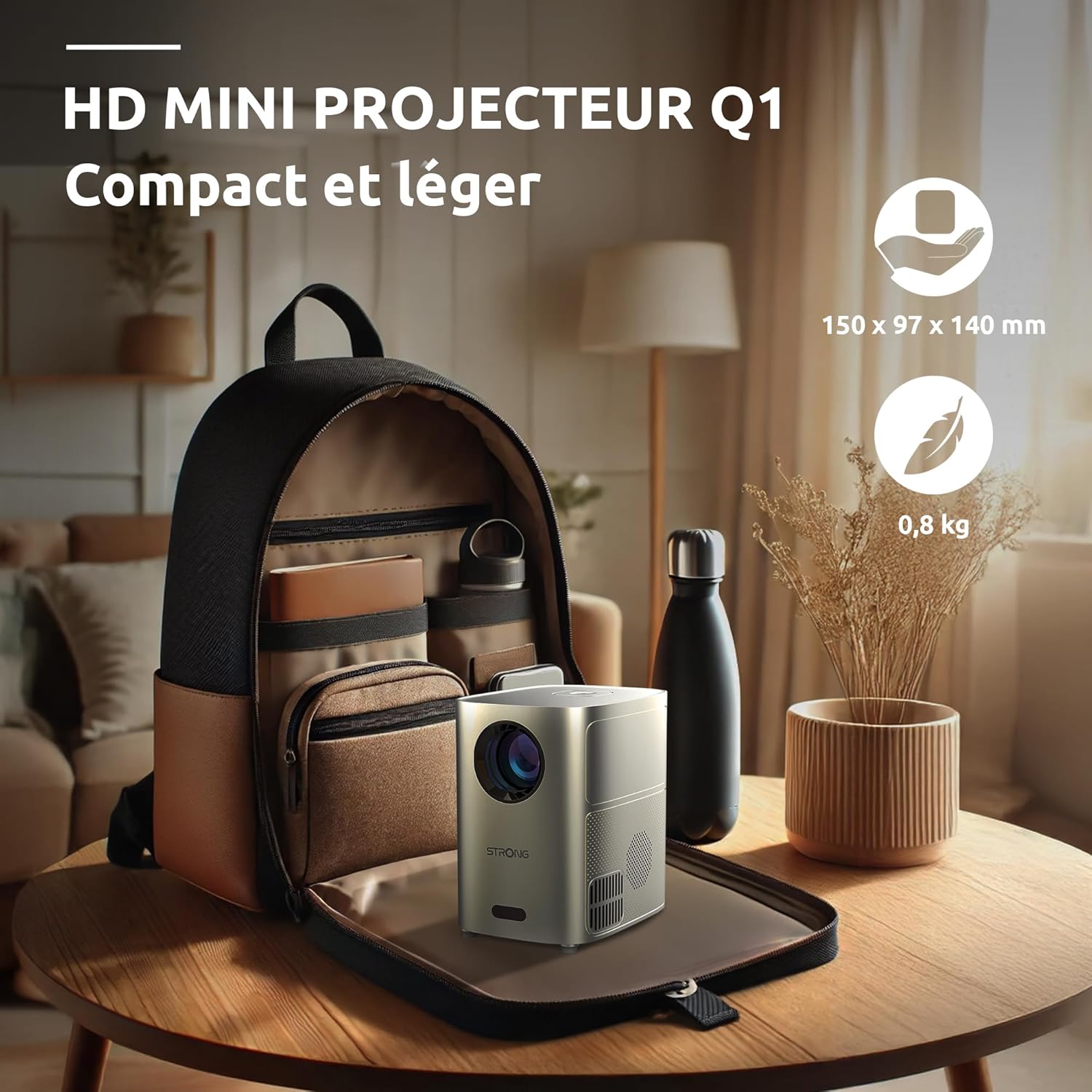 Notre appareil privilégie un format compact et léger pour simplifier le transport entre différents lieux d’usage. Le châssis de 800 grammes autorise une installation rapide sur n’importe quel support horizontal stable. Cette conception portable permet de transformer chaque pièce en salle de projection en quelques secondes.