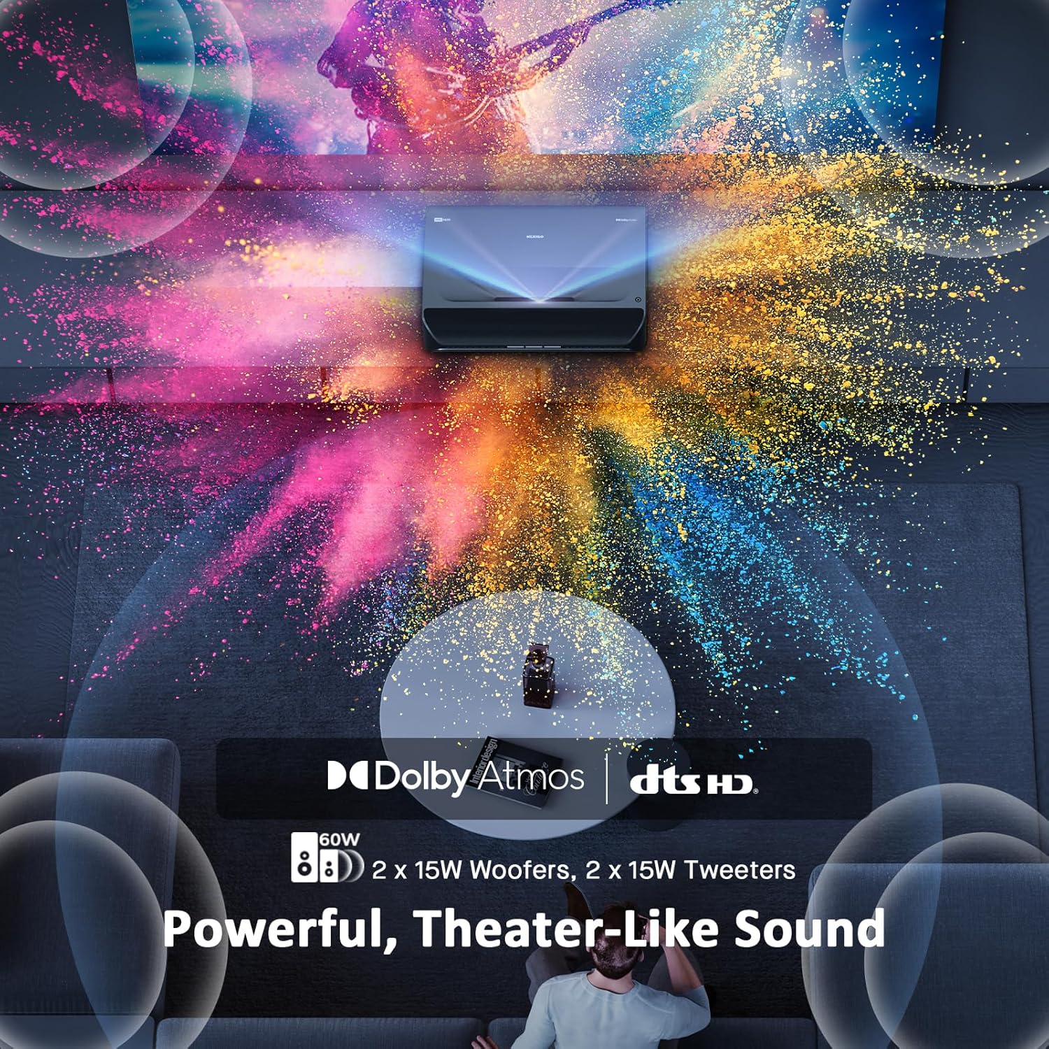 Notre vidéoprojecteur laser à très courte distance de haute puissance acoustique embarque quatre haut-parleurs pour une puissance totale de 60 watts, répartis en deux woofers de 15 watts dédiés aux fréquences graves et deux tweeters de 15 watts assurant la restitution des fréquences aiguës. Cette configuration stéréo full-range offre un rendu sonore équilibré et puissant, capable de couvrir une grande pièce avec une clarté acoustique et une présence remarquables. La compatibilité Dolby Atmos avec prise en charge de l’eARC permet de bénéficier d’un son spatial tridimensionnel lorsque la source le supporte, enveloppant l’auditeur dans un espace sonore cohérent avec l’image projetée. La prise en charge de la 3D active complète cette offre immersive en ajoutant une dimension visuelle supplémentaire pour les contenus compatibles.