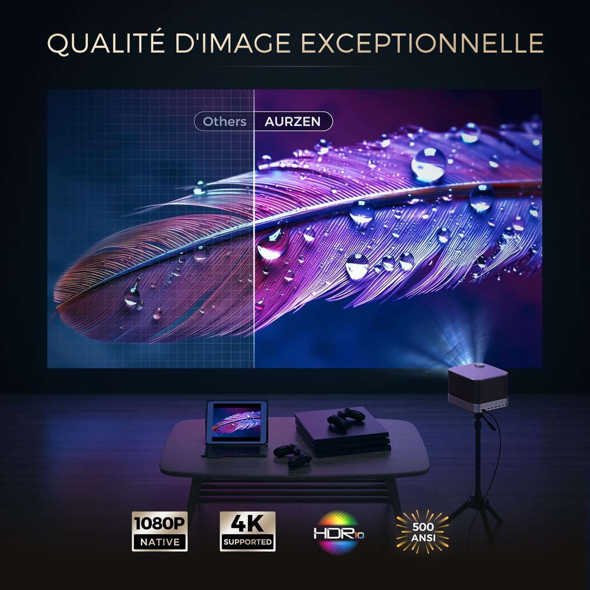 Notre appareil dispose d’une intensité lumineuse réelle de 500 ANSI Lumens exploitant une source LED durable. La technologie HDR10 optimise les niveaux de contraste pour préserver les détails dans les zones sombres. Le châssis portable facilite le transport pour vos projections nocturnes en plein air. La puissance totale de 140 Watts assure un fonctionnement stable sur secteur 100-240V.