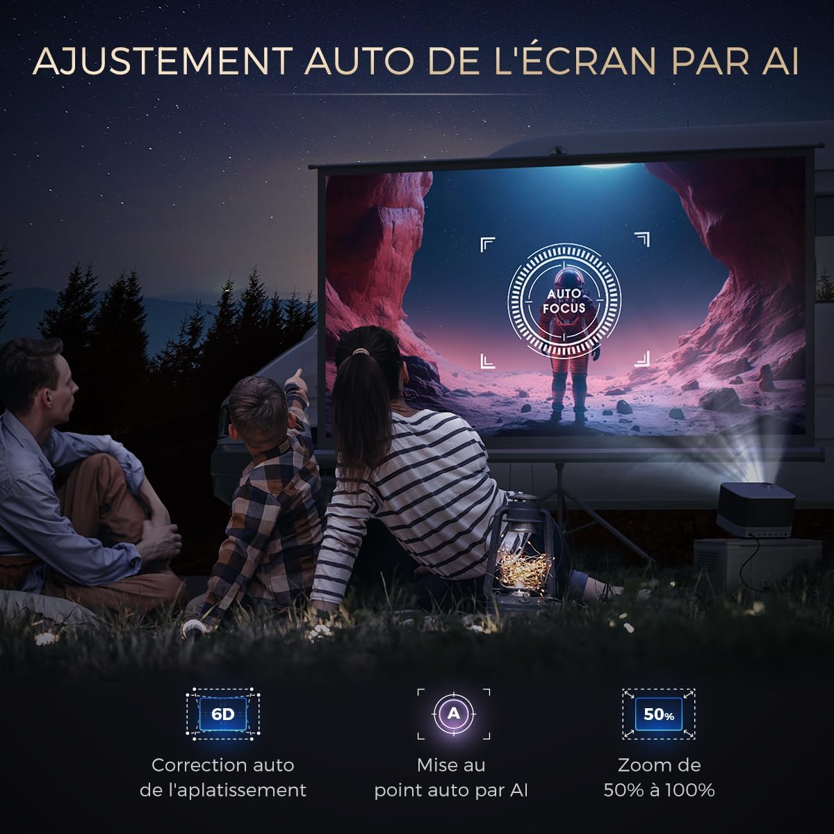 L’algorithme d’intelligence artificielle gère la mise au point automatique via 9 gyroscopes directionnels. La correction trapézoïdale 6D ajuste la géométrie de l’écran sur un angle de ± 45° de façon autonome. La fonction zoom numérique réduit la taille de l’image de 100 % à 50 % sans déplacement physique. Ces systèmes garantissent une image rectangulaire précise sur tout support plat.