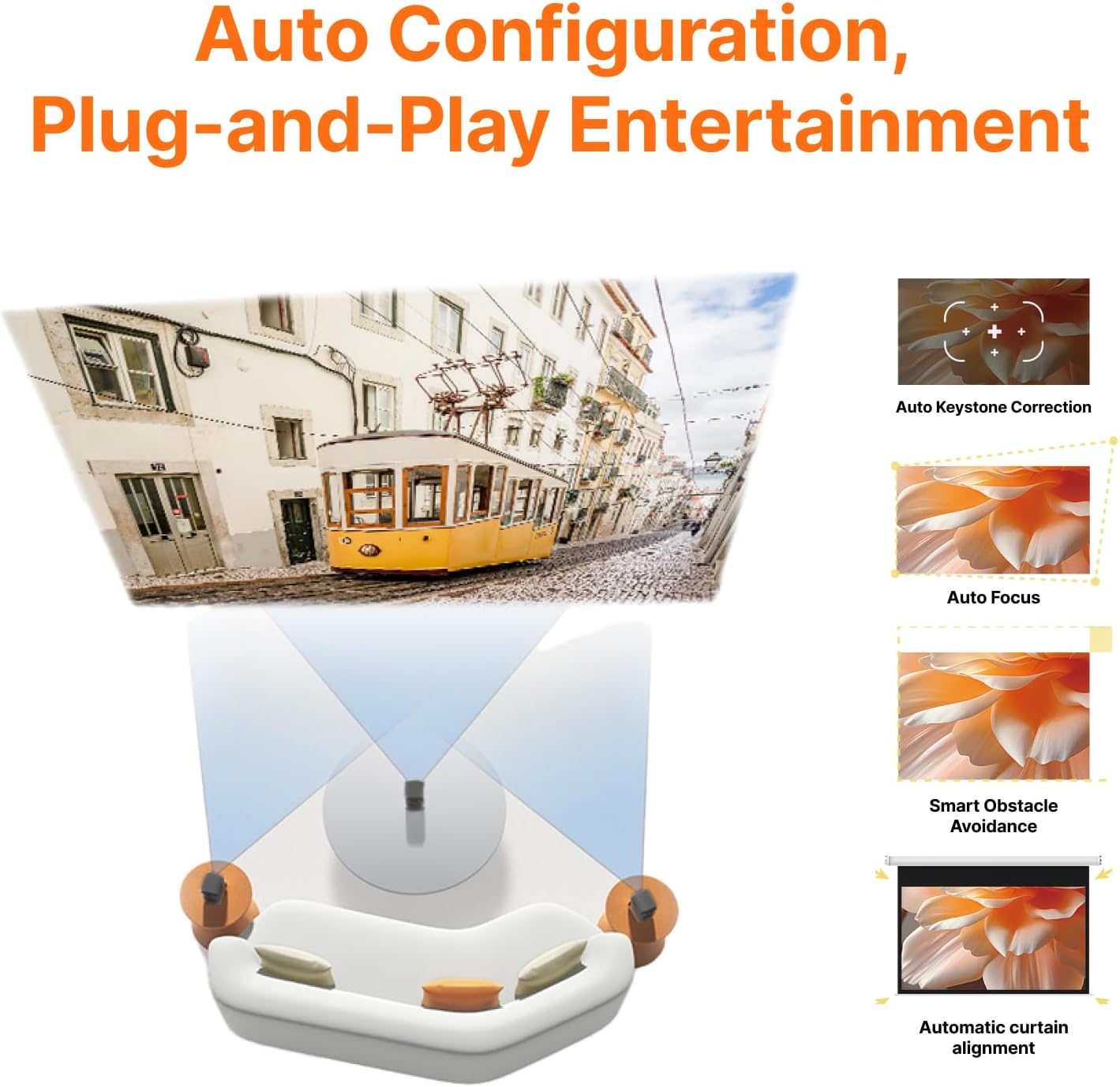Notre système de réglage intelligent inclut un Auto Focus rapide dès l’allumage pour une netteté instantanée. La correction trapézoïdale automatique 6D rectifie la géométrie de l’image même en cas de projection latérale. La fonction d’évitement des obstacles adapte la taille de l’écran pour contourner les éléments présents sur le mur.