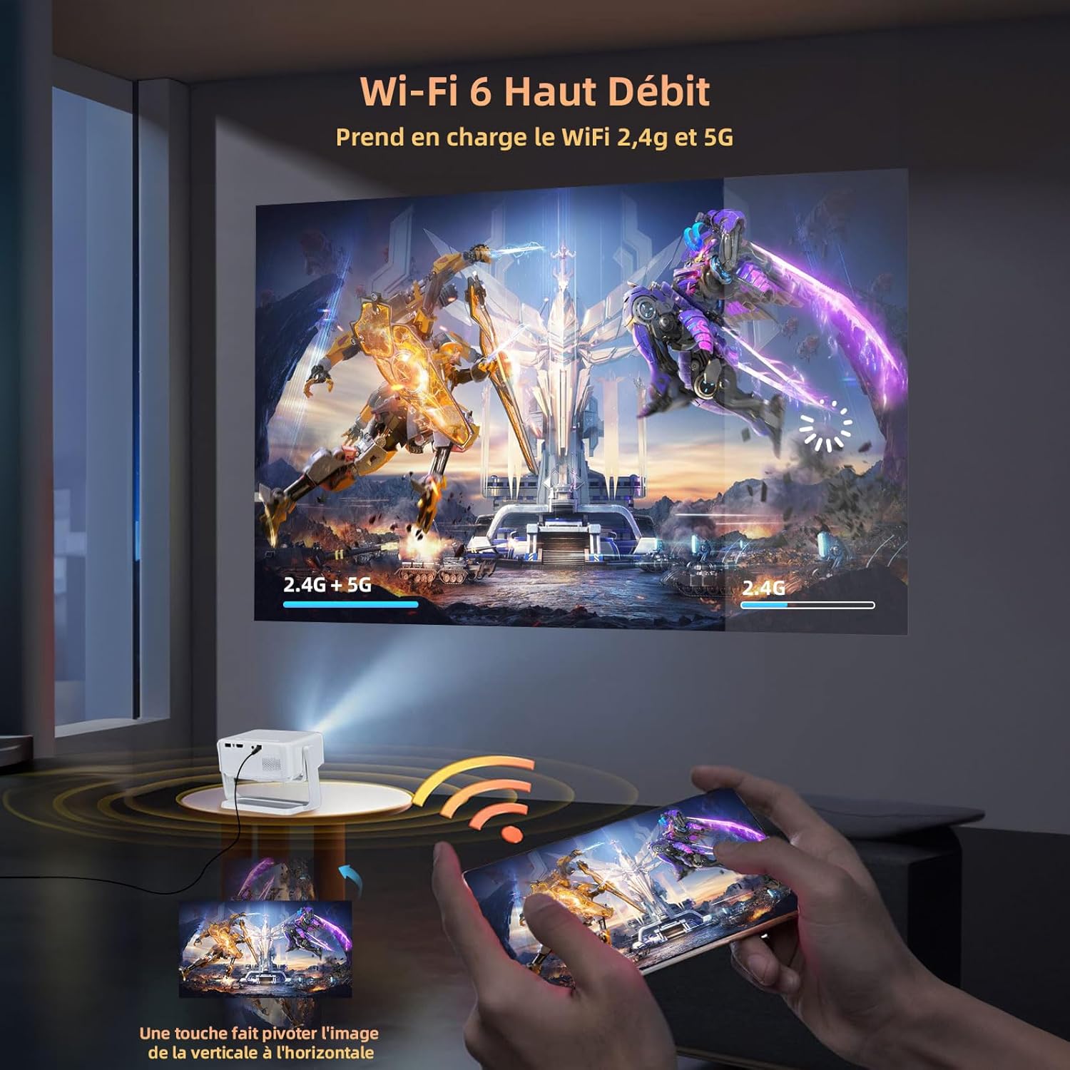 Notre Vidéo Projecteur Portable 1080P est conçu pour une utilisation polyvalente en intérieur, combinant résolution native Full HD, format compact et connectivité sans fil avancée. Son format portable facilite le transport et l’installation sur table, tandis que sa projection jusqu’à 220 pouces permet une adaptation à différents environnements. Grâce à sa rotation 360° et ses réglages automatiques, l’image s’ajuste rapidement selon la configuration. L’intégration du WiFi 6 et du Bluetooth assure une compatibilité étendue avec divers appareils multimédias.
