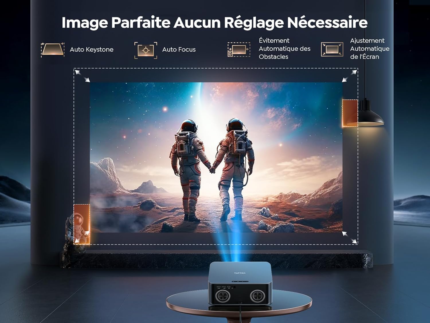 Notre dispositif dispose d’un système de mise au point automatique qui assure une netteté immédiate dès l’allumage de l’appareil. La correction trapézoïdale automatique rectifie la géométrie de l’image pour obtenir un affichage rectangulaire stable de manière autonome. Des capteurs intelligents gèrent l’évitement des obstacles ainsi que l’alignement précis sur les bords de la toile de projection. Le zoom numérique permet d’ajuster la taille de l’écran de 50 % à 100 % afin de s’adapter à la distance de recul disponible.