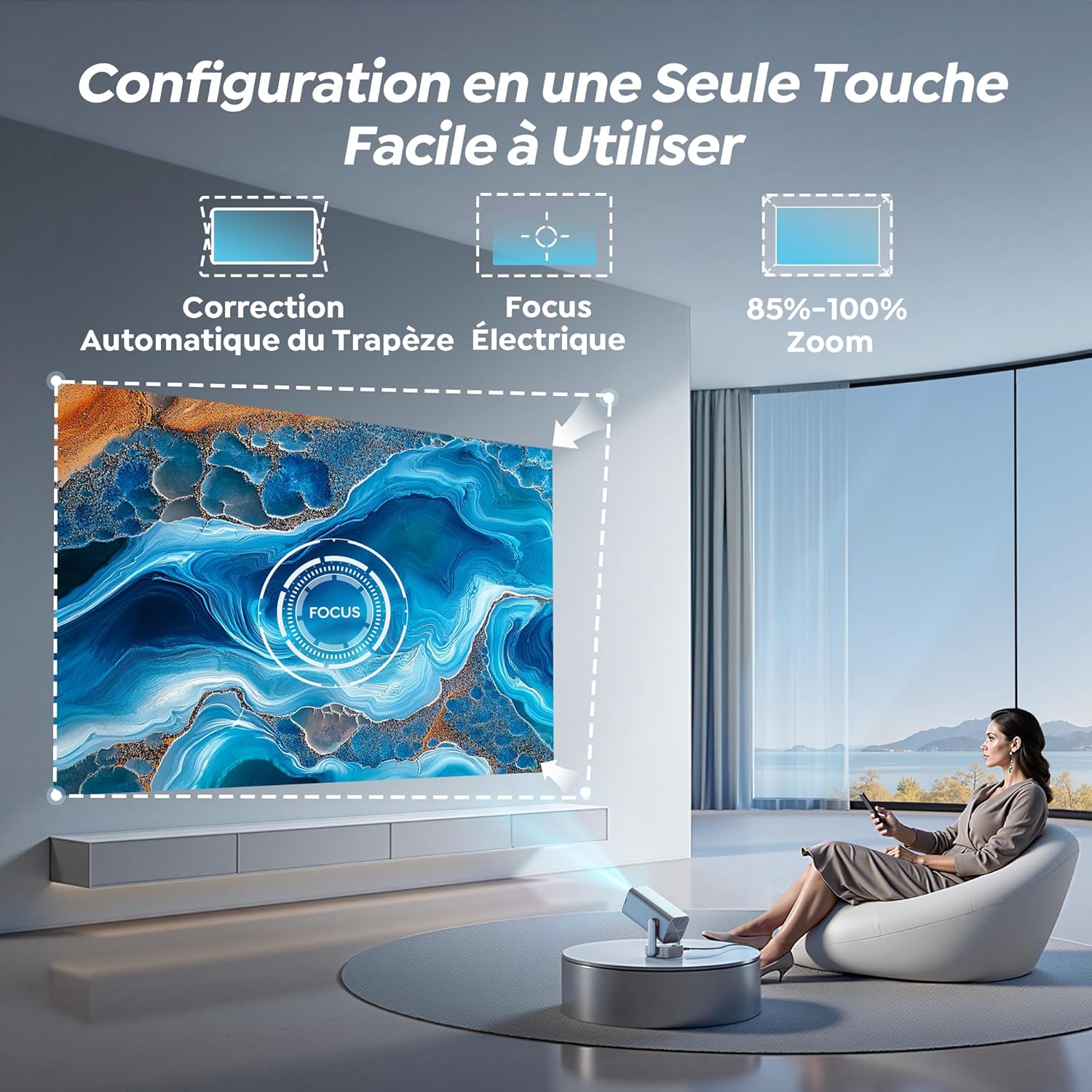 Le réglage de la netteté s’effectue via un Focus Électrique motorisé activable depuis la télécommande en seulement 2 secondes. Notre modèle intègre une Correction Keystone verticale automatique ainsi qu’une Correction 4P (quatre points) pour ajuster les angles manuellement. Ces fonctions permettent de corriger les déformations trapézoïdales si l’appareil n’est pas parfaitement centré face au mur. L’image reste ainsi rectangulaire et proportionnée quel que soit l’angle de projection choisi.