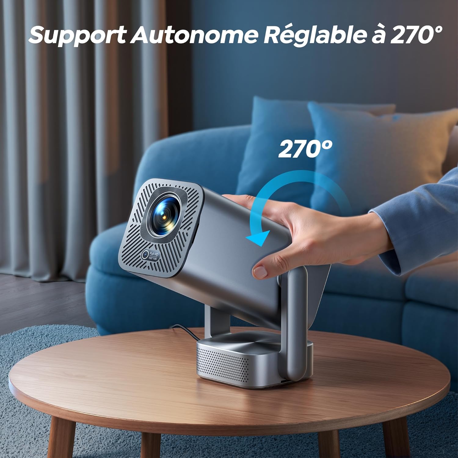 Notre projecteur supporte des tailles d’image allant de 40 à 300 pouces selon la distance de recul, comprise entre 1,2 et 4 mètres. La fonction Zoom numérique de 100% à 85% permet de réduire la taille de l’affichage sans déplacer physiquement le boîtier. Pour la partie sonore, l’unité embarque deux haut-parleurs de 8W fournissant un son surround indépendant. La structure rotative permet une orientation du flux visuel à 270° pour projeter facilement vers le plafond.