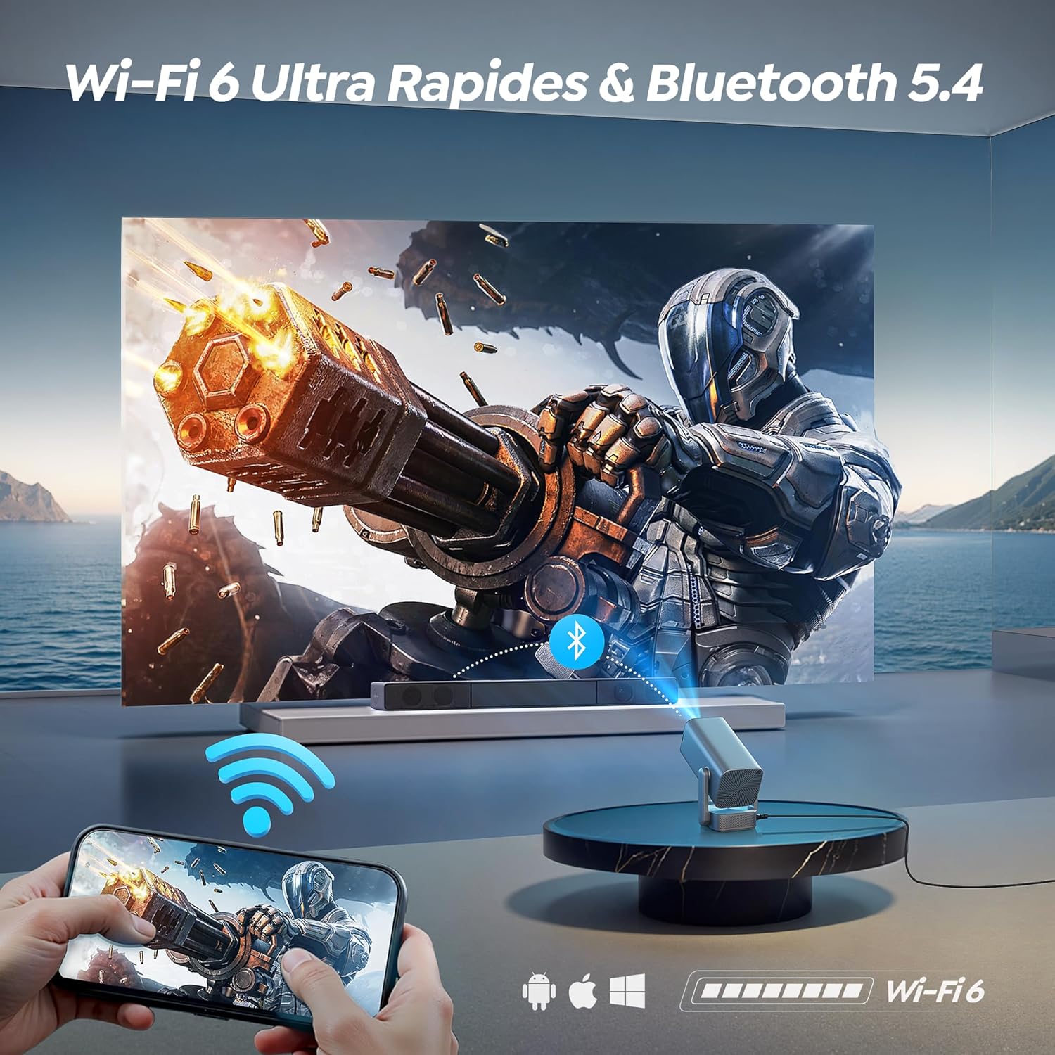 L’intégration de la puce WiFi-6 double bande (2,4G/5G) offre une connexion stable et réduit la latence lors du mirroring depuis un smartphone Android ou iOS. Le module Bluetooth 5.4 permet d’appairer des enceintes externes ou des casques sans fil pour une expérience sonore personnalisée. Les ports physiques incluent le HDMI, l’USB et une sortie audio 3,5 mm pour une compatibilité totale avec les PC et consoles. L’appareil supporte les formats d’encodage vidéo modernes comme le H.264 et le H.265.