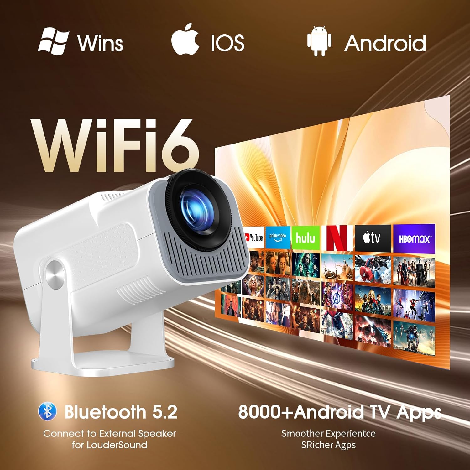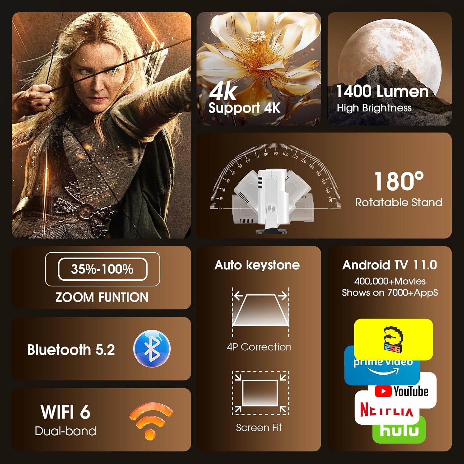 Vidéoprojecteur LED Full HD 1080P, WiFi 6 et Bluetooth 5.2 avec support rotatif 180°