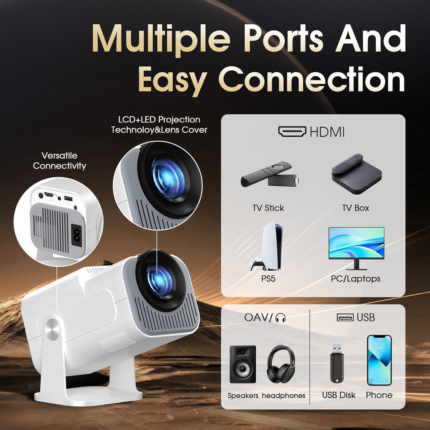 Ce modèle combine une résolution native 1080P, un support rotatif à 180° et une double interface de commande pour une flexibilité totale en intérieur comme en extérieur. Grâce à son système Android et sa connectivité WiFi 6, ce Vidéo Projecteur Portable USB répond aux exigences techniques des utilisateurs cherchant une solution multimédia autonome et compacte.
