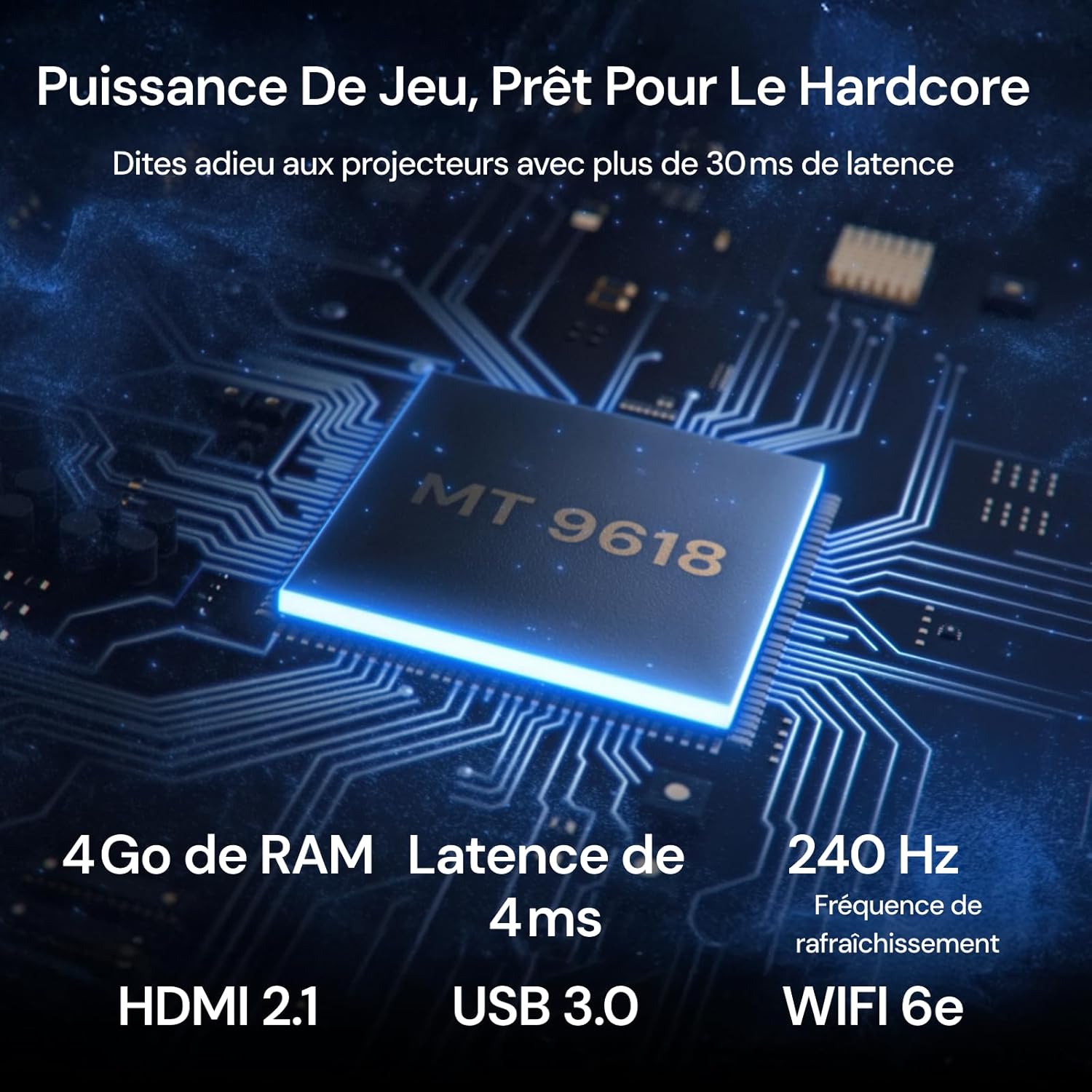 Le chipset MT9618 couplé à 4 Go de RAM assure un temps de réponse ultra-rapide de 4 ms pour les jeux vidéo. Notre projecteur supporte un taux de rafraîchissement de 240 Hz et des formats d’affichage larges en 21:9 ou 32:9. Des modes dédiés FPS, RPG et RCG optimisent les paramètres de latence et de visibilité nocturne pour les joueurs compétitifs.