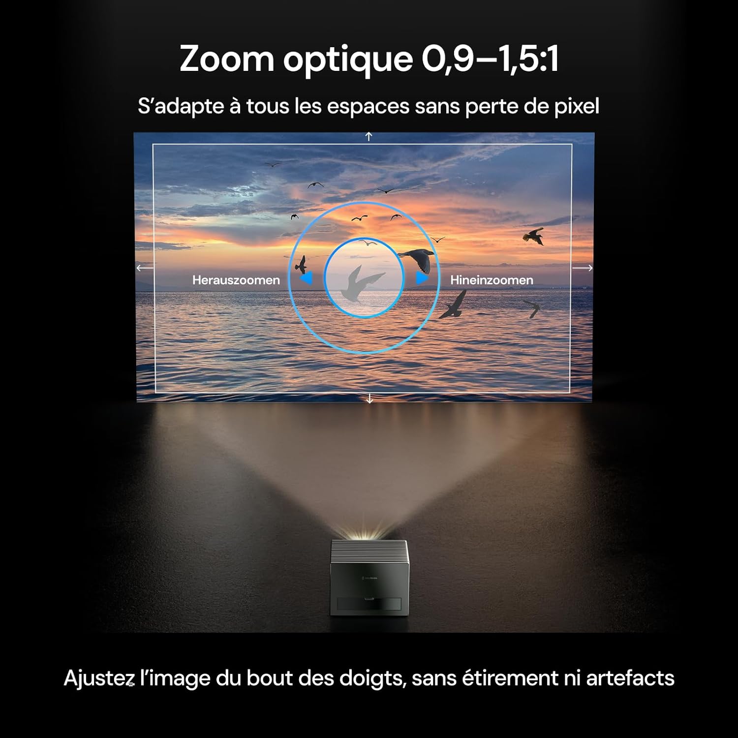 Le système de lentilles OpticFlex propose un rapport de projection variable de 0,9 à 1,5, autorisant une taille d’image allant jusqu’à 300 pouces. Notre dispositif inclut une mise au point automatique ainsi qu’une correction trapézoïdale logicielle pour aligner l’image instantanément. Le zoom optique permet d’ajuster la taille de l’affichage sans dégrader la densité de pixels de la source.