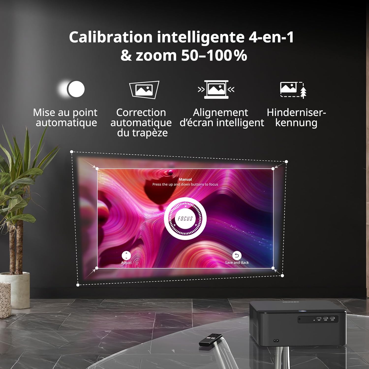 La technologie AI de mise au point automatique ajuste la clarté de l’image en seulement trois secondes. Le capteur de déplacement intégré gère la correction trapézoïdale automatique pour obtenir un rectangle parfait instantanément. Notre fonction zoom numérique permet de réduire la taille de l’image de 100% à 50% sans déplacer l’unité. Ces réglages motorisés simplifient l’installation sur une table ou un support fixe.