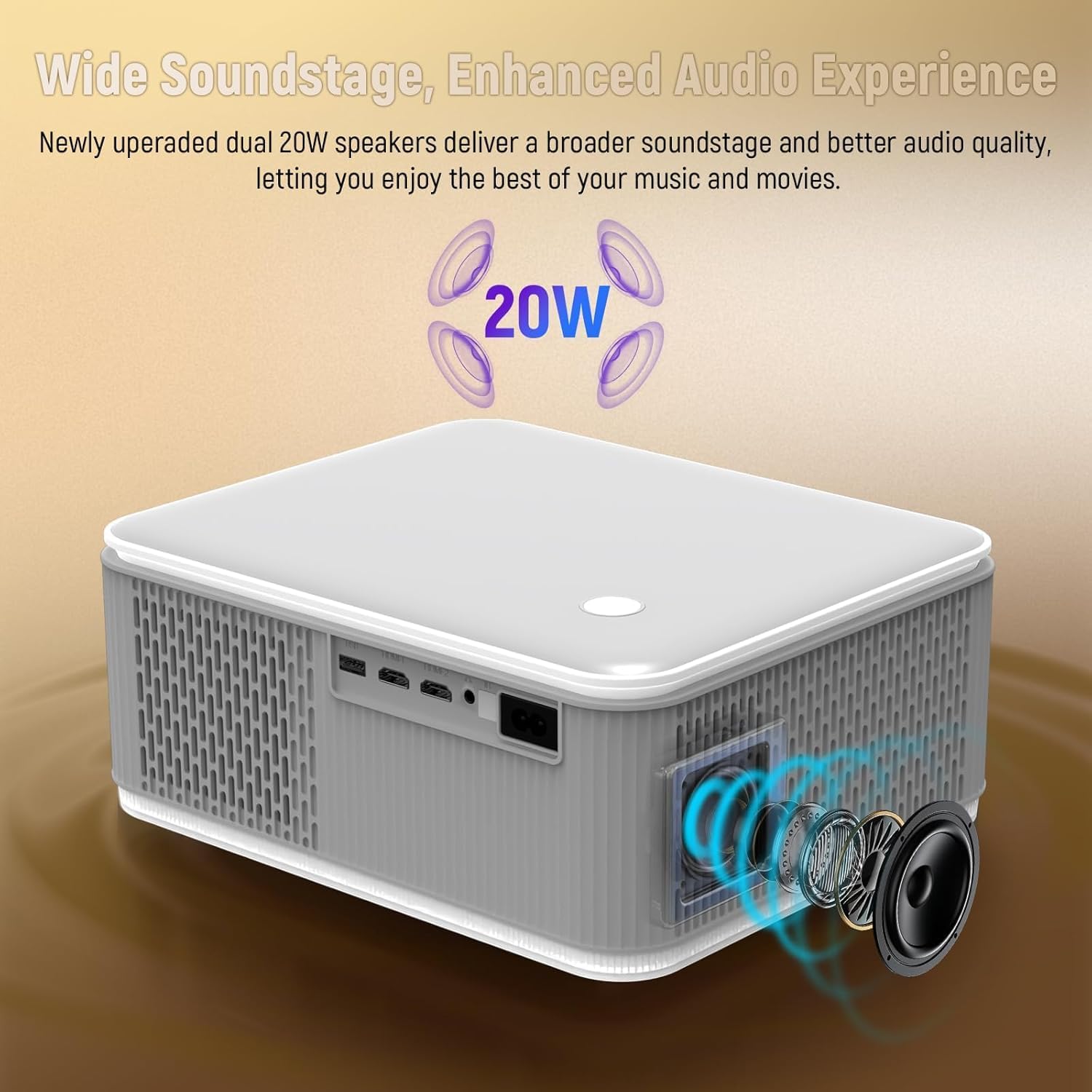 La partie sonore intègre deux haut-parleurs de 6 W chacun, couplés à une amplification numérique pour un rendu stéréo haute fidélité. Les basses fréquences sont renforcées pour gagner en profondeur sans distorsion harmonique. Côté connectique, l’appareil dispose de ports HDMI et USB pour relier des consoles de jeux, des PC ou des lecteurs multimédias. Cette polyvalence matérielle permet la lecture directe de fichiers depuis un support de stockage externe ou une source filaire standard.