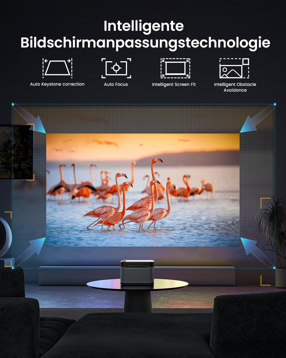 La mise au point s’effectue via un système d’autofocus précis qui élimine tout réglage manuel à l’allumage. La correction trapézoïdale automatique agit sur un angle de 40 degrés verticalement et horizontalement. Le projecteur intègre également des fonctions d’évitement intelligent d’obstacles et un alignement automatique sur la toile. Ces capteurs garantissent une image parfaitement rectangulaire même si l’appareil est placé de côté.