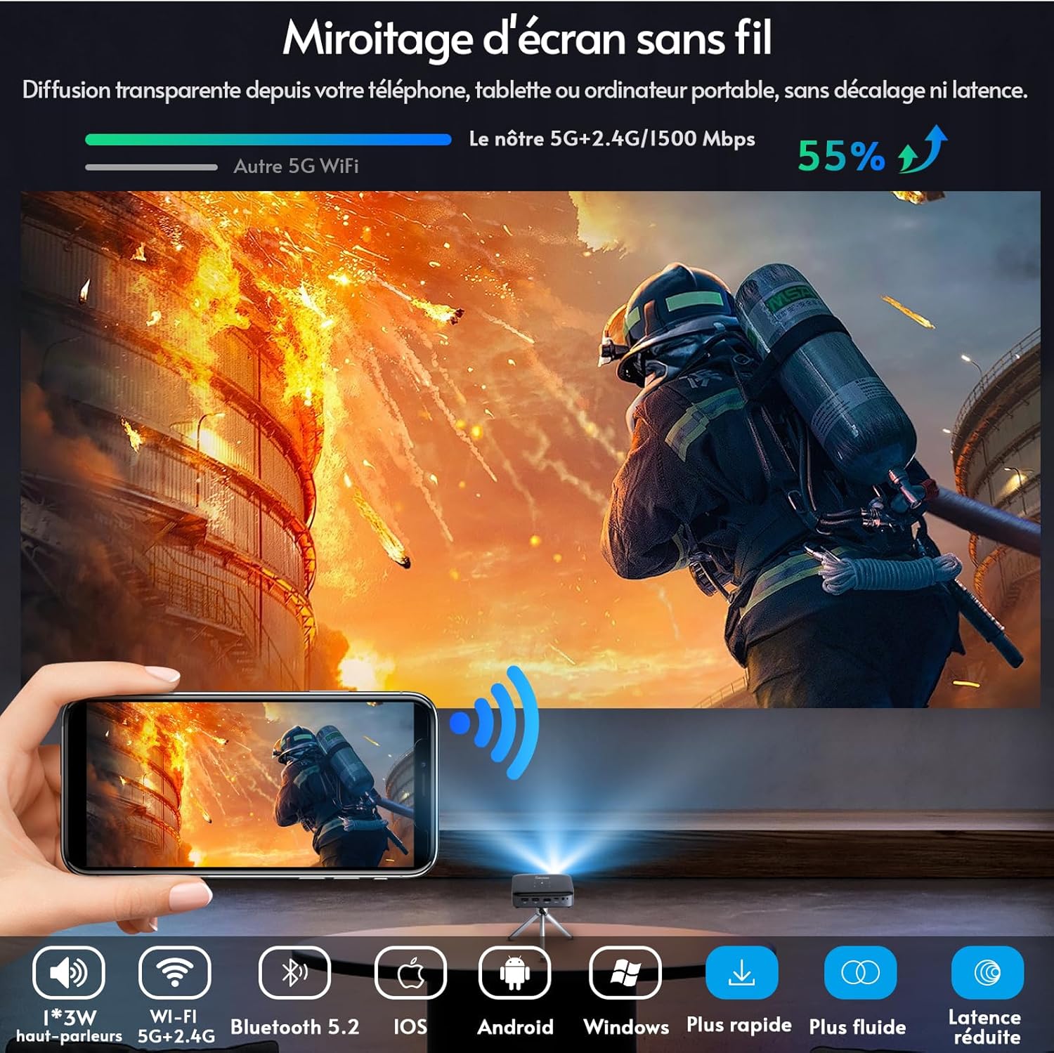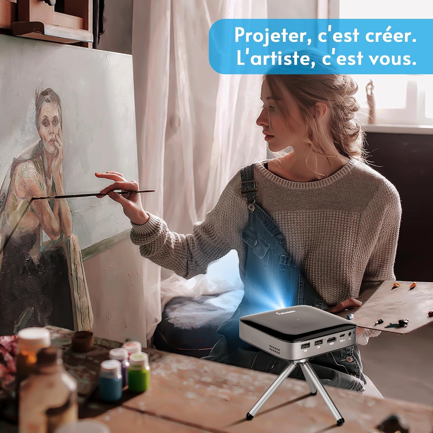 Vidéoprojecteur de Poche DLP 720p avec Support 4K, Batterie Intégrée et Wi-Fi 5G