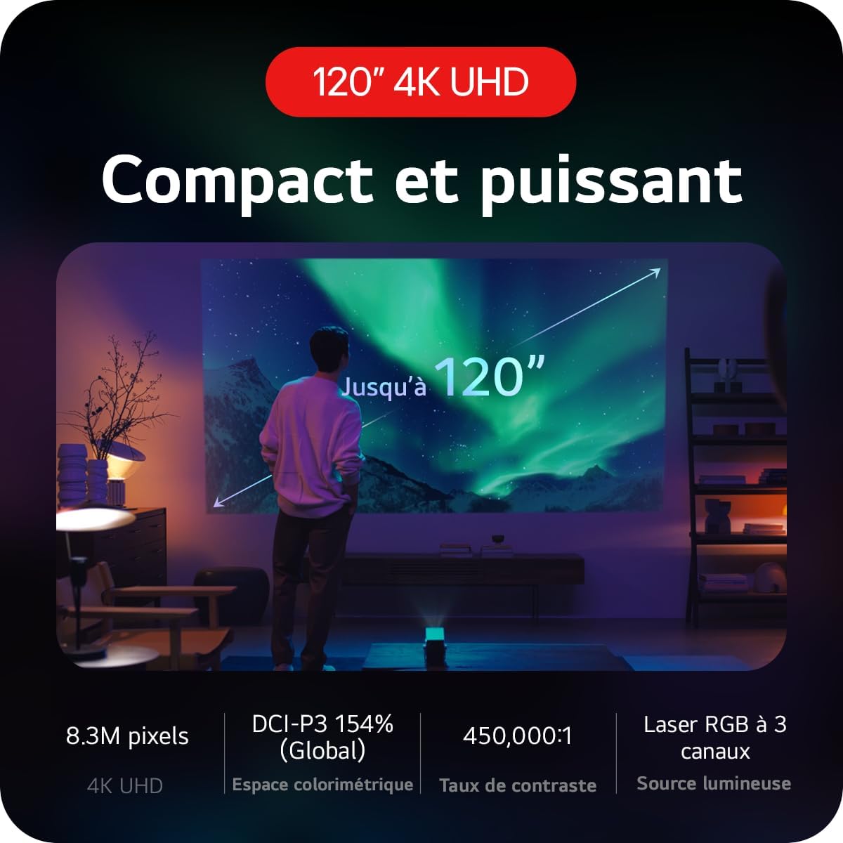 Vidéoprojecteur Laser 4K UHD, 500 Lumens ANSI, Smart webOS et Projection 120″