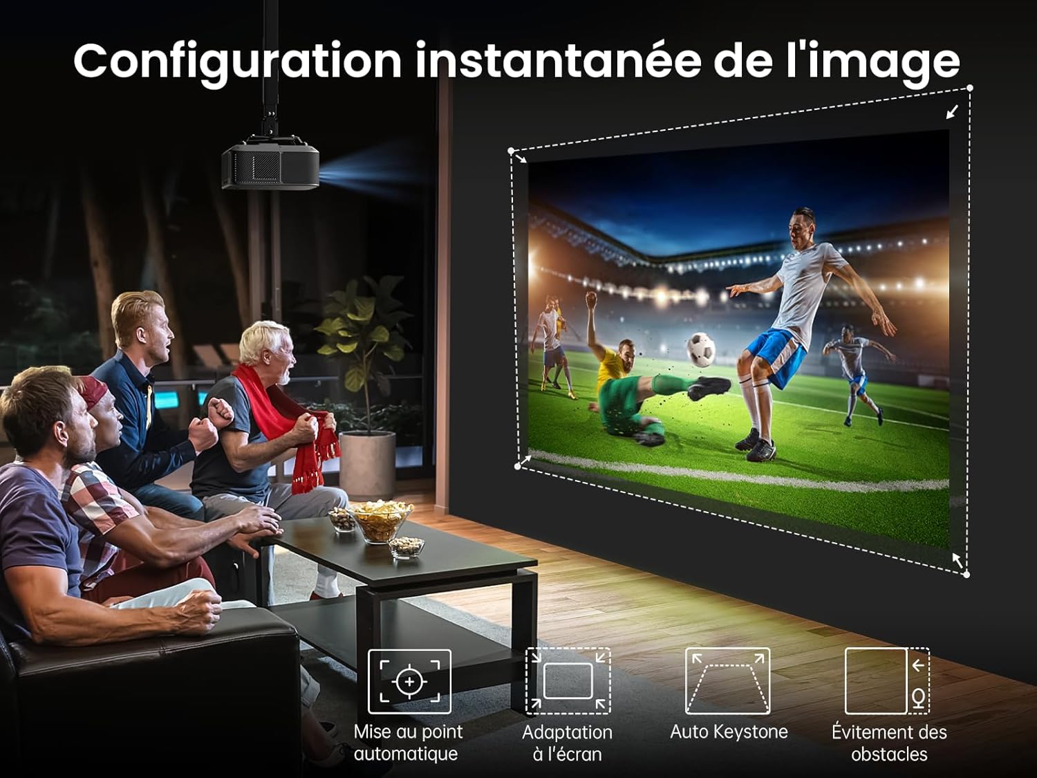 Le projecteur propose une installation flexible, un usage sur table, trépied ou fixation plafond, une distance de projection ajustable, une adaptabilité d’espace et une configuration rapide. La plage de projection entre 1 m et 4 m permet d’obtenir différentes tailles d’image selon l’environnement. L’ensemble garantit une intégration simple, une mise en place rapide, une adaptation domestique et une utilisation polyvalente.