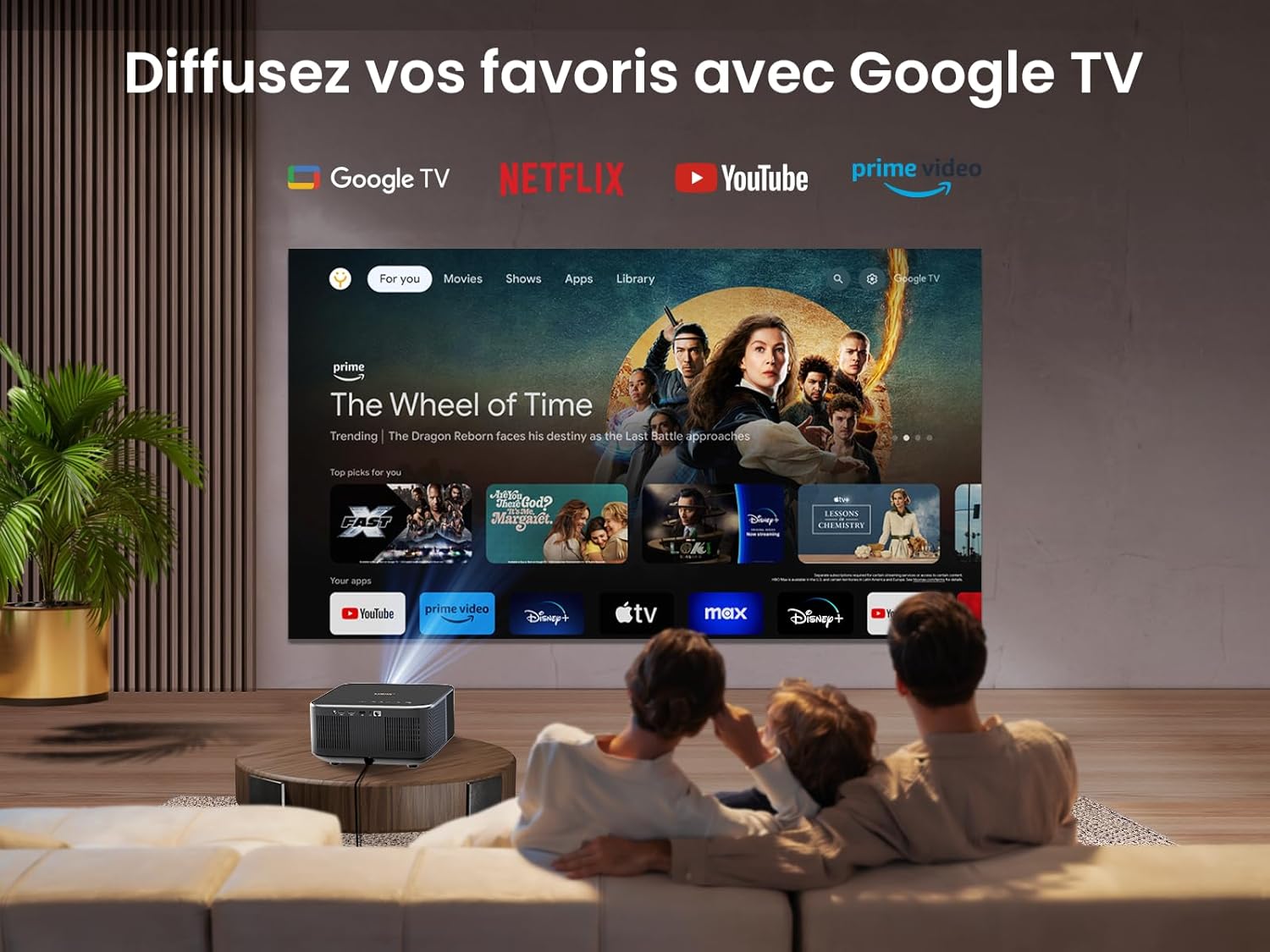 Notre Vidéoprojecteur combine une expérience de projection avancée avec une intégration complète Google TV, une résolution Full HD 1080P, et une gestion intelligente de l’image pour le home cinéma, le gaming et les usages professionnels connectés. Il intègre une luminosité de 990 ISO lumens permettant une projection équilibrée en environnement intérieur avec une restitution précise des couleurs, des contrastes et des textures visuelles. La compatibilité avec le décodage 4K permet l’exploitation de contenus haute définition pour enrichir l’expérience multimédia. L’ensemble est conçu pour une utilisation fluide, moderne et entièrement connectée.
