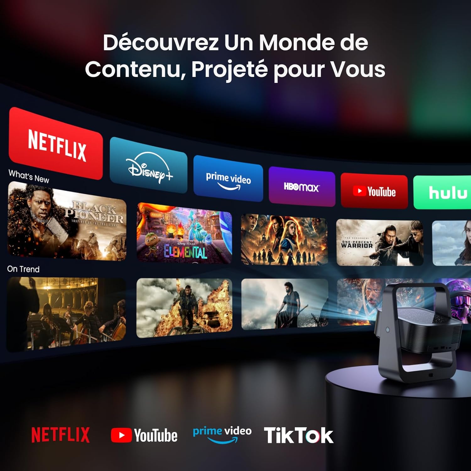 Le haut-parleur interne prend en charge le décodage audio Dolby en ligne pour une restitution sonore équilibrée des graves et des aigus. La technologie de diffusion LED est conçue pour être douce pour les yeux, réduisant la fatigue visuelle lors de sessions prolongées. Ce modèle portable s’adapte aussi bien à un montage sur table, au plafond ou au sol grâce à sa base polyvalente.