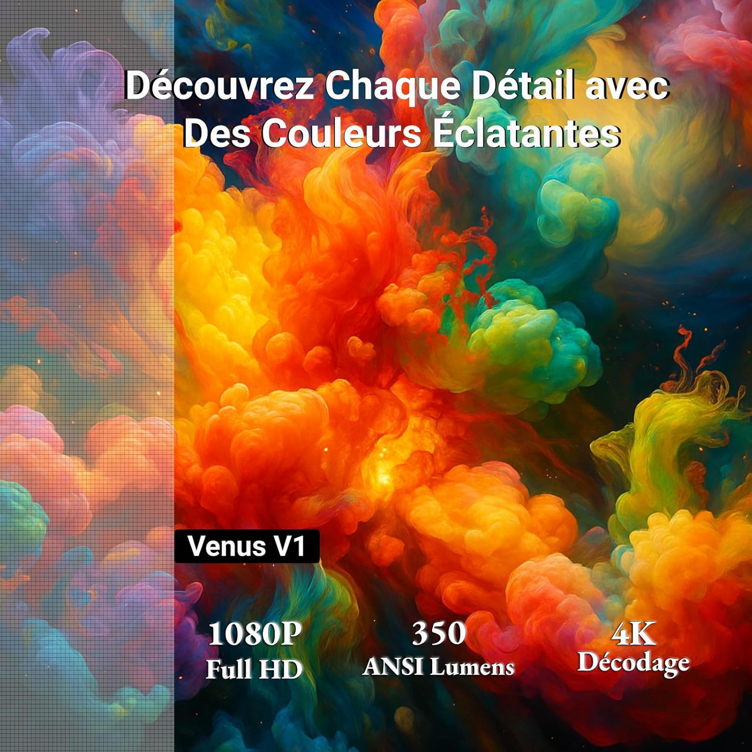 Le moteur optique délivre une résolution native Full HD 1080P avec une prise en charge du décodage 4K pour les fichiers sources compatibles. La source lumineuse LED affiche une intensité de 350 ANSI lumens, garantissant une clarté optimale pour un usage en home cinéma. Le taux de contraste de 10000:1 assure une distinction précise entre les zones sombres et les zones claires de l’image.