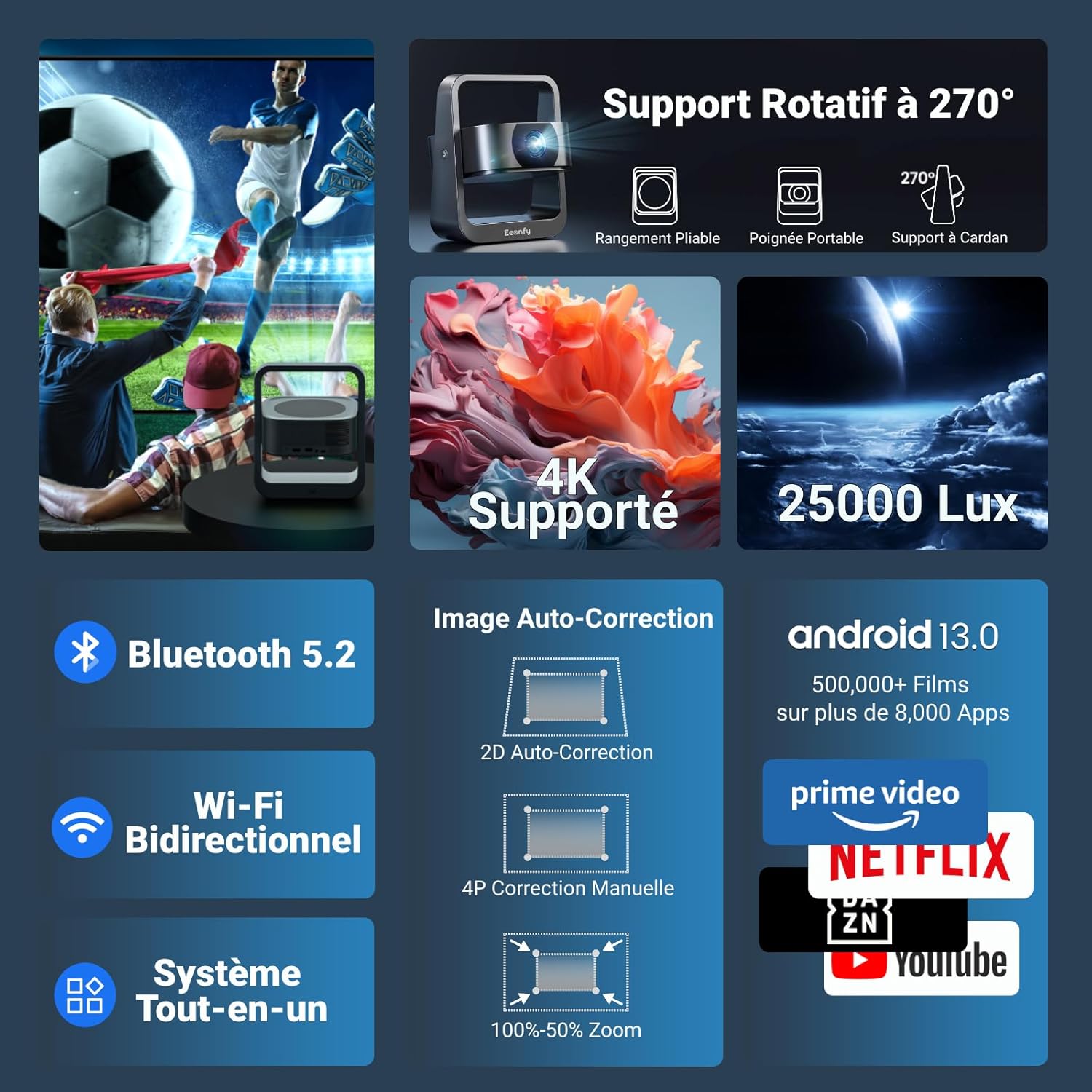 Ce modèle combine une résolution 1080P native et une connectivité WiFi 6 pour un usage domestique ou nomade. Notre Vidéoprojecteur Application Intégrée simplifie le visionnage grâce à son support rotatif à 270° et sa compatibilité avec les périphériques modernes. Ses 350 ANSI lumens garantissent une image nette pour toutes vos soirées cinéma.