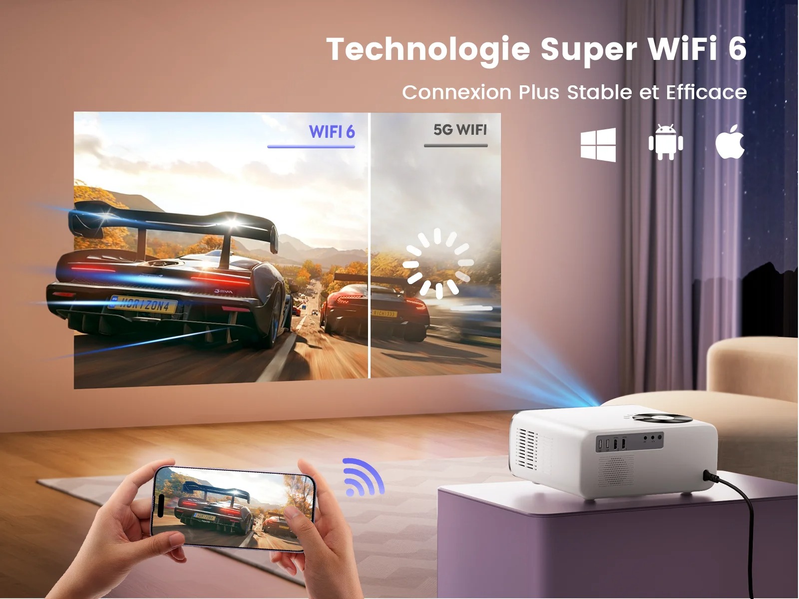 Notre projecteur portable intègre une résolution native de 1920 x 1080 pixels pour garantir une netteté constante sur des surfaces atteignant 300 pouces. Ce Vidéoprojecteur Auto Keystone embarque le système Android 9.0, facilitant l’accès direct à un catalogue de 7000 applications de streaming sans périphériques externes. La technologie WiFi 6 assure une transmission de données stable et rapide pour le partage d’écran depuis des appareils mobiles.