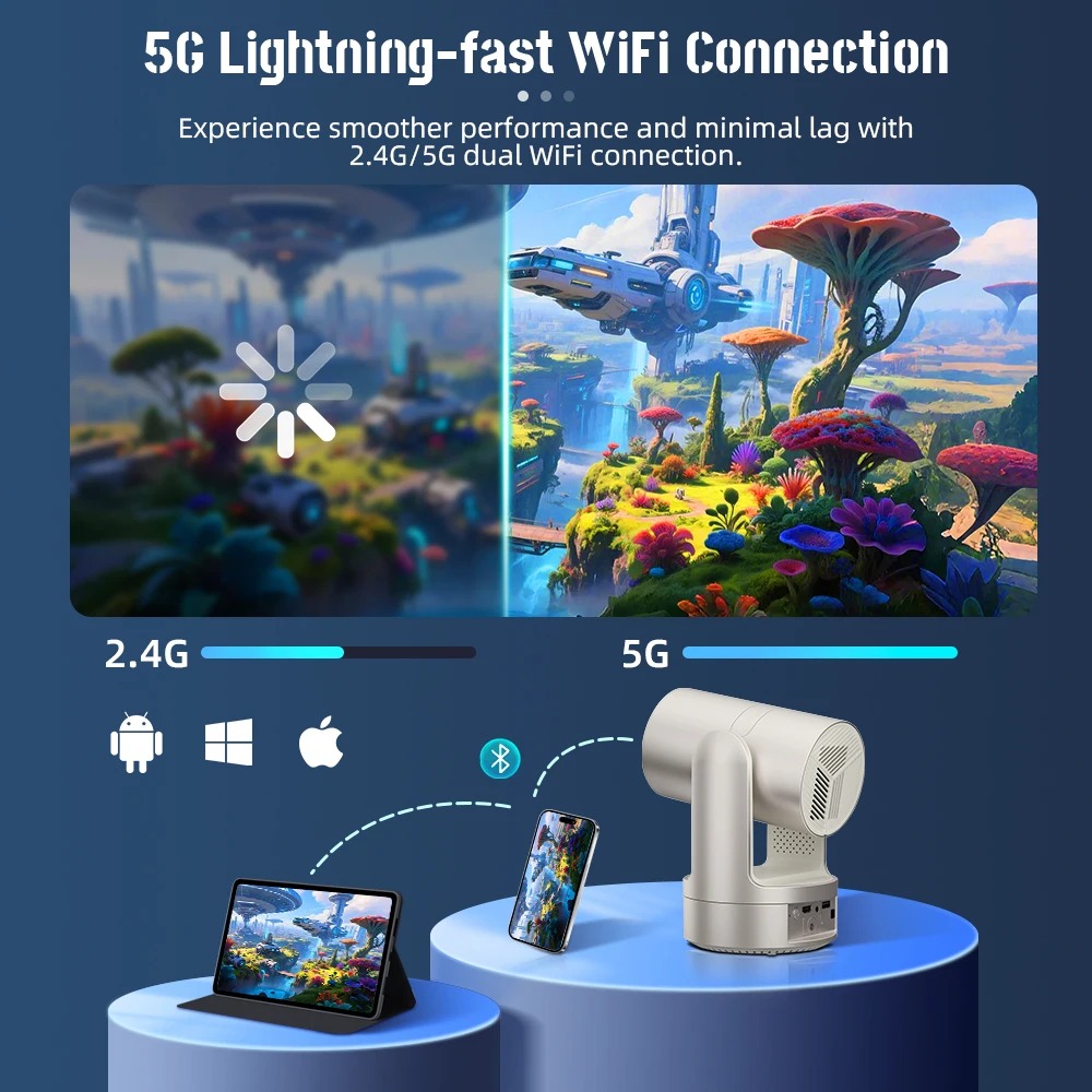 Pensé pour une utilisation flexible en intérieur comme en extérieur, notre Vidéoprojecteur Autonome intègre une batterie rechargeable et un système Android pour une diffusion directe de contenus. Sa résolution HD 720P associée au décodage 4K permet d’afficher des images adaptées aux usages multimédias. Sa connectivité étendue et sa portabilité facilitent son intégration dans différents environnements. Il s’adapte aussi bien aux présentations qu’aux séances cinéma ou gaming.