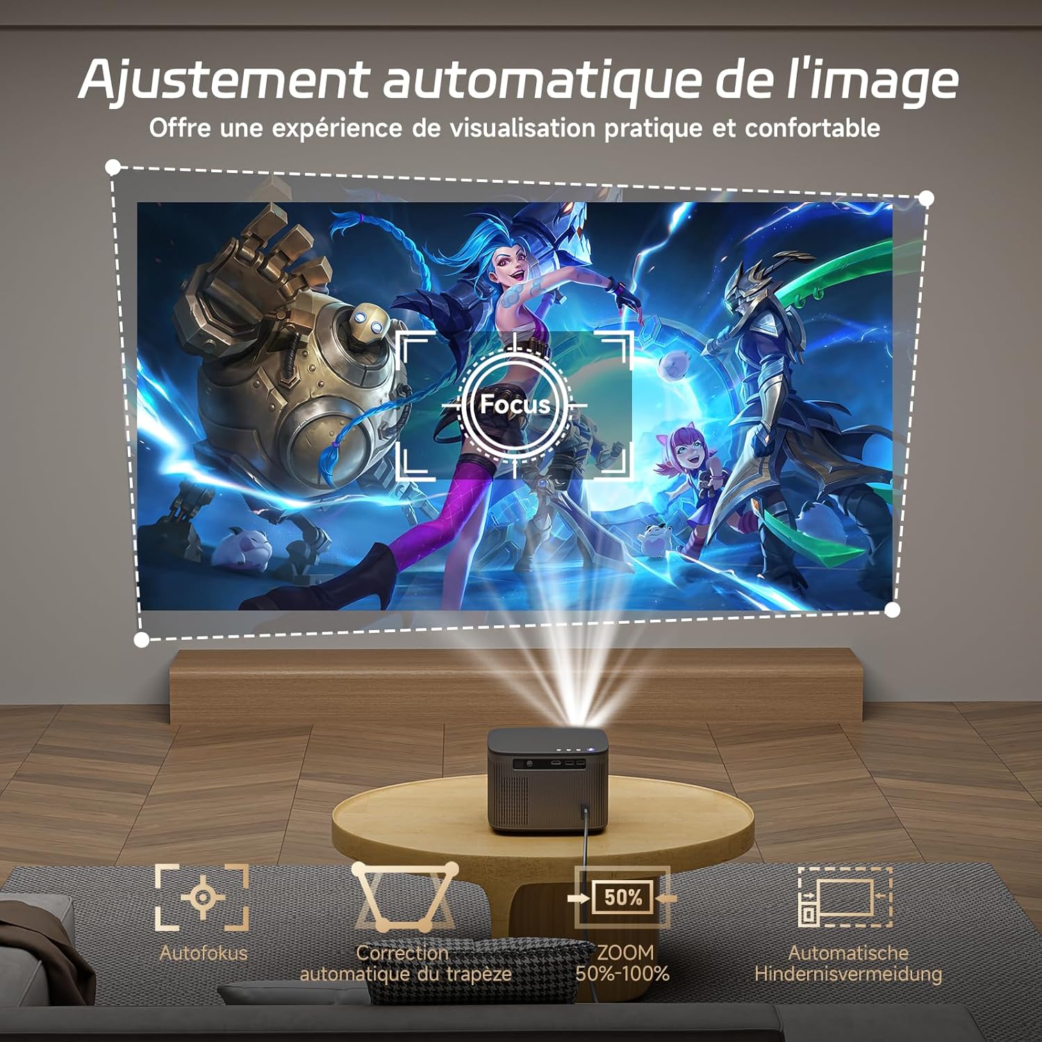 Le système de détection en cinq dimensions réalise une mise au point automatique en seulement 3 secondes. La correction trapézoïdale automatique redresse instantanément l’image, que le projecteur soit placé de face ou sur le côté. Notre technologie d’évitement d’obstacles identifie les éléments muraux pour repositionner l’affichage dans une zone libre. L’alignement sur écran détecte les bordures du cadre pour une insertion millimétrée de la projection.