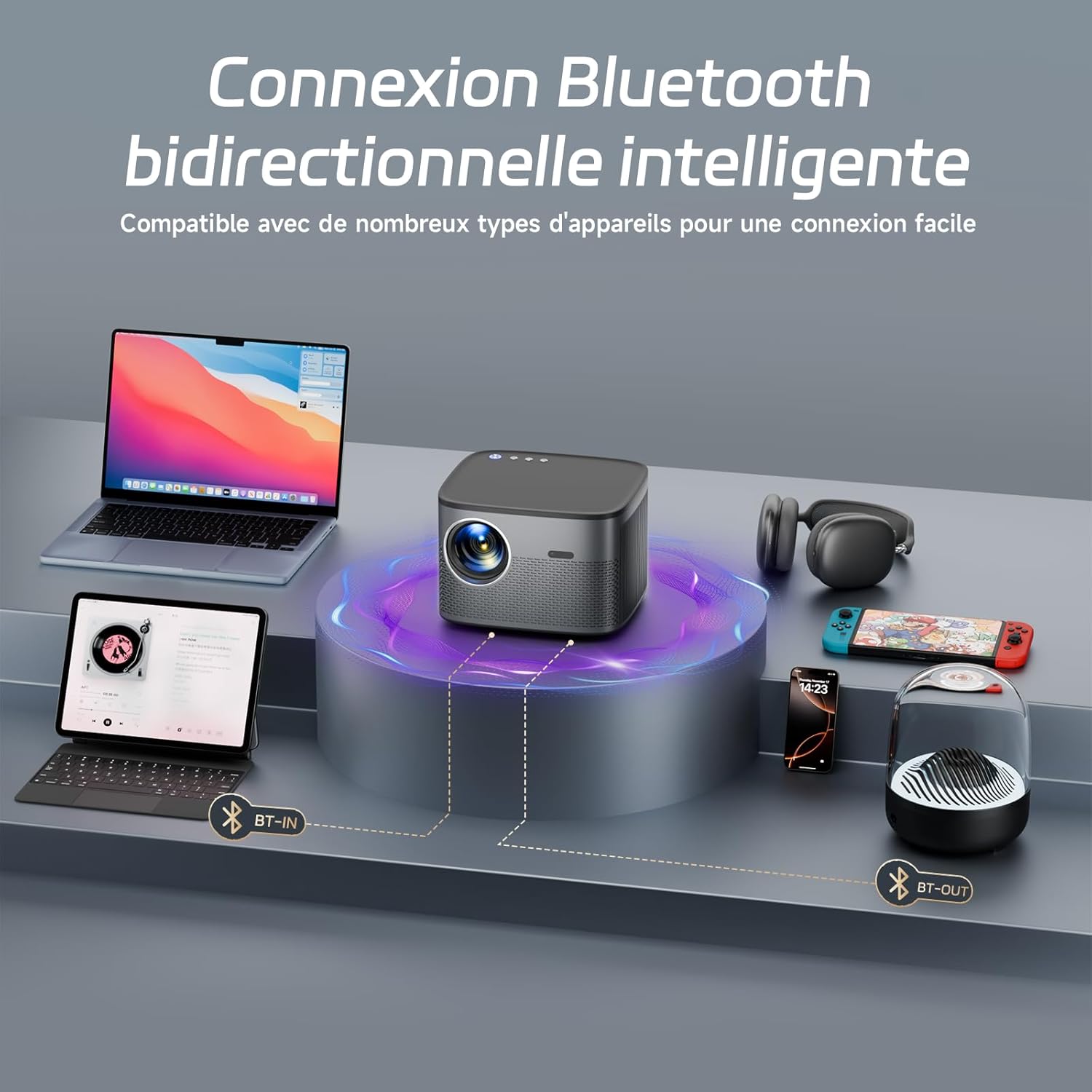 La puce WiFi 6 double bande (2.4G/5G) autorise une transmission de données rapide pour le mirroring des smartphones iOS et Android. Le module Bluetooth 5.2 bidirectionnel permet d’utiliser l’appareil comme une enceinte indépendante ou de le connecter à un casque externe. Cette norme sans fil réduit la latence audio et augmente la portée du signal jusqu’à 10 mètres. Les haut-parleurs intégrés avec pot passif renforcent les basses fréquences pour une immersion sonore complète.