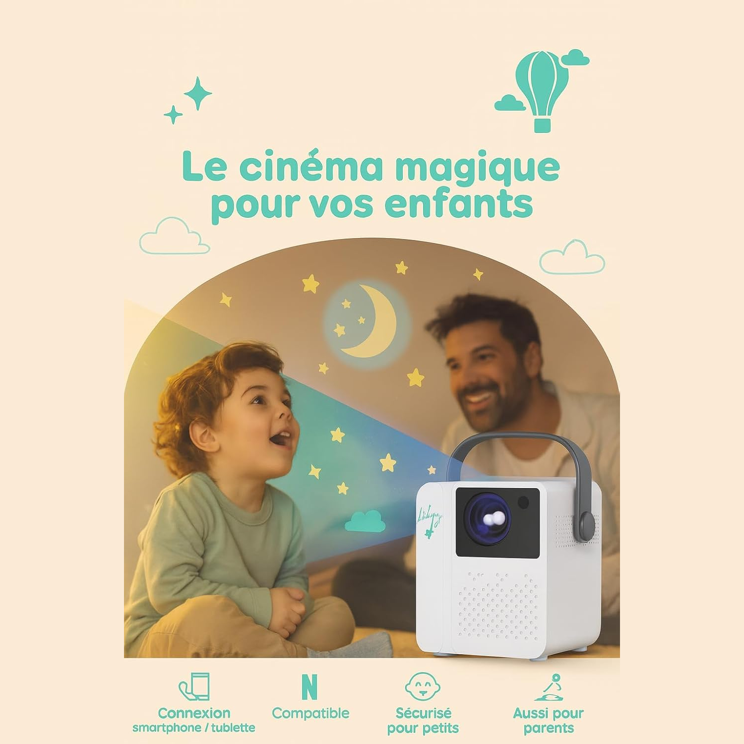 Notre Vidéoprojecteur Chambre Enfant est conçu pour offrir une expérience visuelle immersive adaptée aux plus jeunes, tout en intégrant des technologies modernes de projection LED. Il propose une résolution native Full HD 1920 × 1080, avec une compatibilité d’affichage jusqu’à HD 1280 × 720 pour différents types de contenus. Son format compact et portable permet une installation simple dans une chambre ou tout autre espace intérieur. La connectivité Wi-Fi et Bluetooth facilite l’accès aux contenus multimédias depuis plusieurs sources. L’ensemble est pensé pour un usage familial orienté divertissement et projection d’histoires, vidéos et dessins animés.