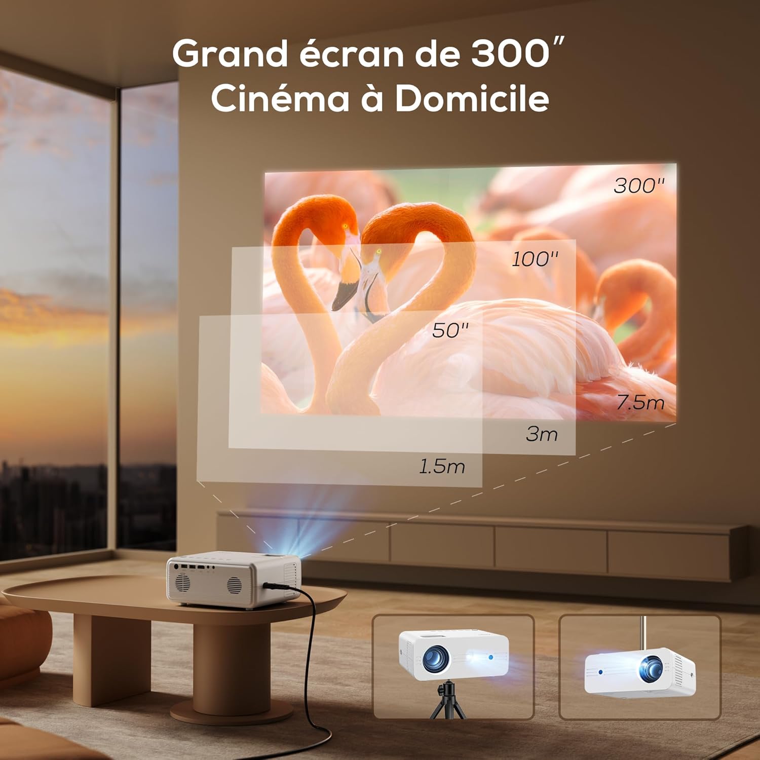 Notre modèle dispose d’une fonction zoom à 75% et d’une correction trapézoïdale de ±20° pour ajuster le cadre sans déplacer l’unité. La taille de projection varie de 40 à 300 pouces selon la distance, avec un réglage recommandé entre 1,5 et 2,8 mètres. Un trépied en métal ultra-durable accompagne le produit, doté d’une tête pivotante à 360° pour un positionnement angulaire précis. Le support de fixation permet une installation au plafond, sur un mur ou sur une table.