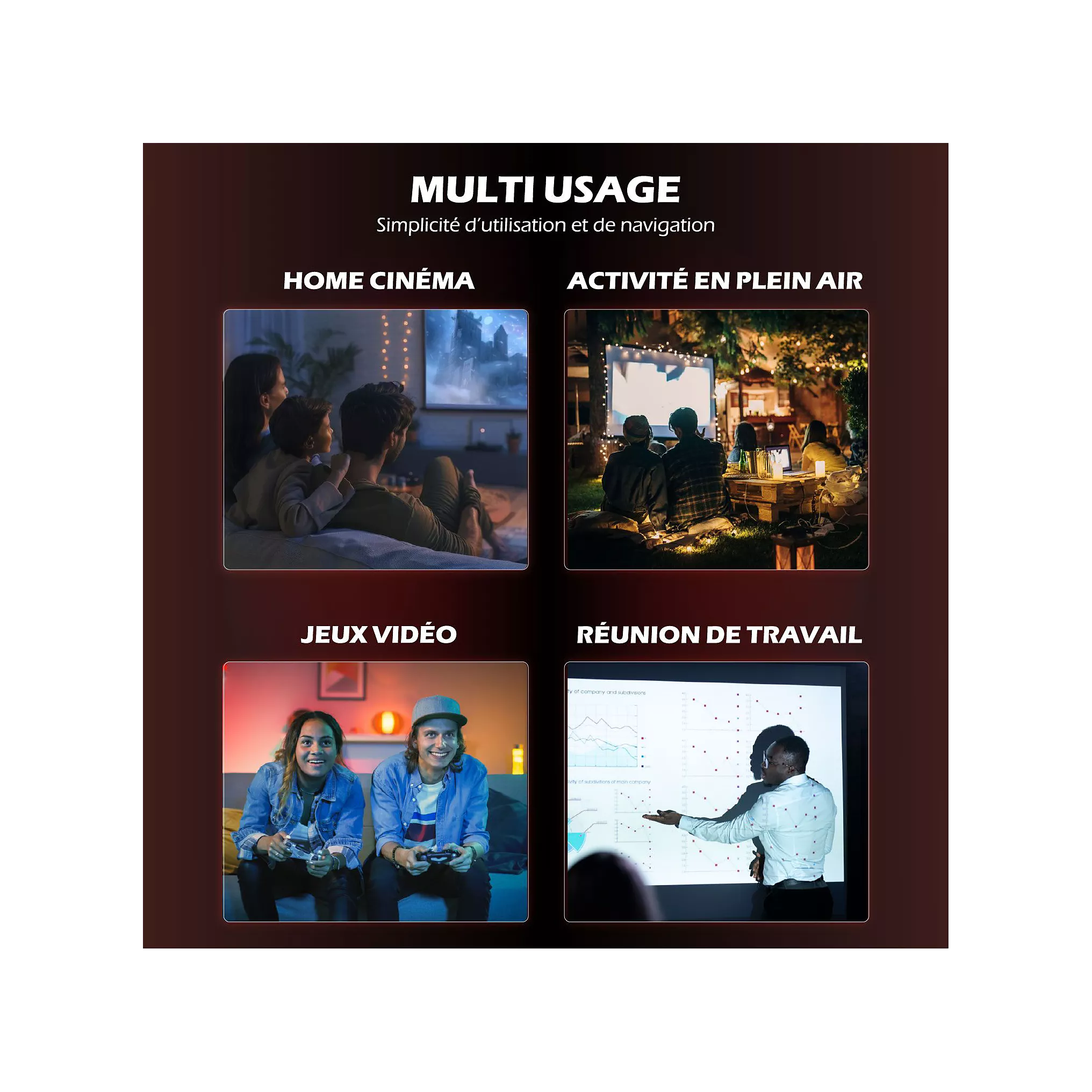 Avec une luminosité de 280 ANSI lumens, notre vidéoprojecteur est adapté à un environnement intérieur avec maîtrise de la lumière ambiante. La technologie LED utilisée garantit une durée de vie supérieure à 50 000 heures, assurant une utilisation prolongée sans remplacement fréquent de la source lumineuse. L’intensité lumineuse est calibrée pour restituer des images nettes sur des surfaces adaptées à la projection home cinéma. Cette configuration permet une restitution homogène des couleurs et des contrastes dans des conditions maîtrisées.